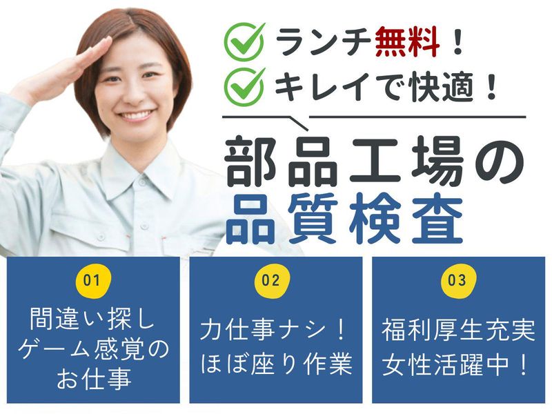 求めている人材 +・。*~+・。*~+・。*~+・。*~ 未経験の方も大歓迎! シンプルな仕事でコツコツ働きたい。 しっかりと収入を確保したい方にピッタリ。 +・。*~+・。*~+・。*~+・。*~ 集中してコツコツ取り組むのが得意な方 にぴったりのお仕事です。 目の前の作業に夢中になれるタイプの方なら 時間が経つのもあっという間。 まるでパズルゲームのように、 “小さな違い”を見つける瞬間に やりがいを感じられます。 経験や資格は一切不要。 先輩も未経験から始めた方がほとんどです。 現在は20〜40代の女性スタッフが活躍中! 綺麗で空調も整った環境の中で、 自分のペースで働きたい方におすすめです。 +・。*~+・。*~+・。*~+・。*~ \ こんな方にもおすすめ / ・派遣デビューの方 ・軽作業・製造未経験の方 ・フリーターの方 ・商品検品・仕分け・ピッキングなどに興味のある方 \こんなお仕事を探している方にピッタリ/ ・箱詰め・ラベル貼り・シール貼りなどの軽作業 ・工場などの品質検査、品質管理業務 ・ラインで部品の仕分け、梱包を行う業務 ・シンプルな工程でコツコツ働ける仕事