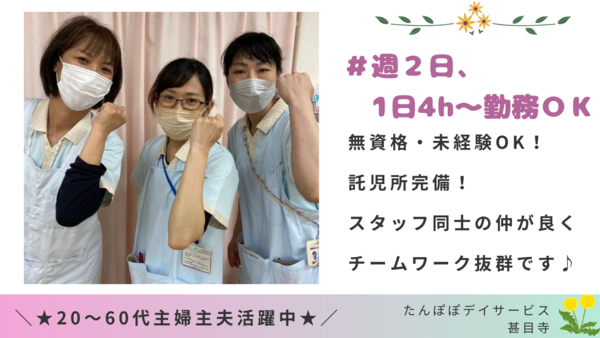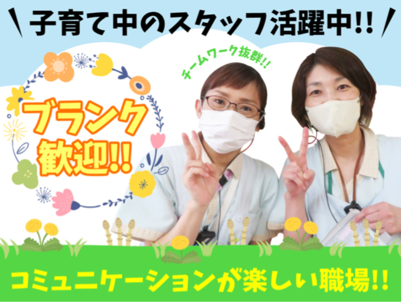 仕事内容 『子育てと仕事の両立が大変...』 『お子さんに時間をさけない...』 そんなママさんにぴったりなのが”たんぽぽデイサービス甚目寺” 【おしごと内容】 バイタルチェック、リハビリ、処置、食事介助 など介護業務と看護業務全般です。 「デイサービス看護師の仕事は、ご利用者の体調チェックや感染症対策、小さな変化を見逃さないことが仕事です。ご利用者やご家族が安心できる環境づくりが最大の役割です!」 - 【スタッフの方々に聞きました!】 Q1.入社の決め手は何ですか? A1.子供がいて、土日祝は子供の面倒を見る人がいないので託児所があることが魅力的でした* Q2.実際に働いてみてどう感じましたか? A2.子供の体調不良の際に、お休みを頂くのですがスタッフの方々が快く受け入れてくださります。本当に助かってます!その代わりと言ってはなんですが、自分の出られる日は出勤しています。助け合いの風土がとても良いです! Q3.働いて良かったと思った瞬間はどんなときですか? A3.仕事が忙しいときでもスタッフ同士で声を掛け合って、チームワーク良く働けている瞬間です! Q4.一緒に働くスタッフの方はどんな感じですか? A4.明るいスタッフが多く、自分も自然と笑っていることが多いです(笑)また、わからないことを聞いても嫌な顔をせず丁寧に教えてくれます。 - 【職場環境】 ・あま市にある定員100名のデイサービス ・2フロアで開放的。お風呂場も南向きで明るい空間! ・決まったスケジュール(カリキュラム)なし ・見守りやすい!他のスタッフとの連携が取りやすい!時間に追われない! ・在籍スタッフ55名(介護・看護職36名)