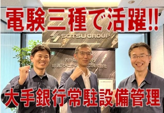 ★入社祝い金有★【大手銀行ビルの常駐設備員】資格・経験を活かしませんか!土日祝休/昇給・賞与あり 正社員 経験や資格スキルを習得してさらなるキャリアアップを目指せる環境で、腰を据えて働きませんか! *当社は80年以上の歴史を持つ綜通グループの一企業。 *三菱UFJ銀行と長年の取引関係があり、同行の本部ビル・営業店・寮社宅等を多数管理している他、親会社:綜通(株)の保有する物件等、主にオフィスビルの設備・清掃・警備を手がけています。 *コミュニケーションを大切にしながら、日々の業務を地道に丁寧に行うことで銀行、ビルオーナーやテナントと長期的に安定した信頼関係を築いてきました。堅実に事業展開している安定企業です。
