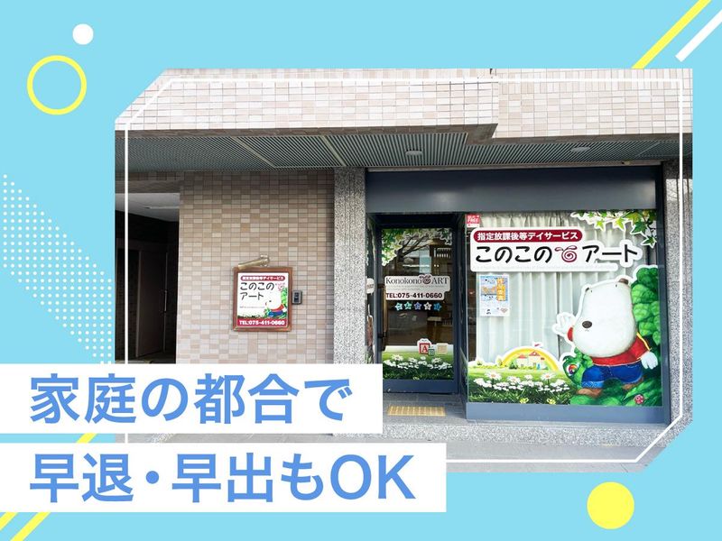 職場環境 個展や展覧会などを主なアウトプットの場所としており、 過去には、当施設の児童作品が京都市長賞を3年連続受賞★ 表彰されて心の底から喜ぶ子どもたちの愛らしい表情や 誇りに感じられる親御さんの姿に刺激をうけ、感動しながらお仕事ができるやりがいのある仕事です! 喫煙所:なし(敷地内全て禁煙)