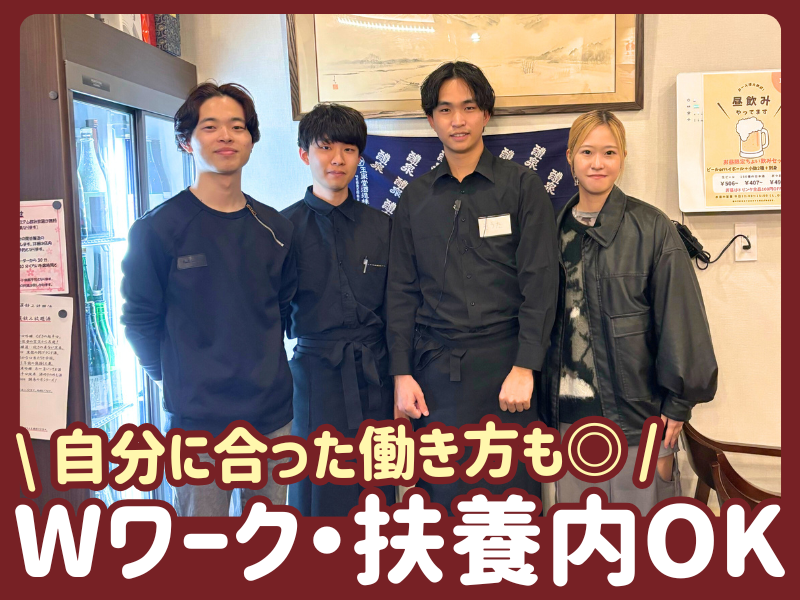 仕事内容 \働き方、もっと自由に。/ 「自分の予定に合わせて働きたい」 そんなあなたにぴったりの環境です♪ ●シフトは週1日・1日2h~OK! ●土日だけ/平日だけ ●Wワークや扶養内勤務もOK! ●旅行でのお休み、かけもち先との両立 など事前相談して調整できるから安心! ●髪型髪色自由!ピアスもOK! ●金曜・祝前日は時給100円UP! ●終電考慮!駅チカ徒歩5分の好立地♪ ✨✨売上目標達成で500円支給もあり✨✨ ⇒1月は7日間分達成手当を支給しました◎ …………………………………………………… ✨活躍中のスタッフも私生活と両立中✨ たとえば… ・土日は家庭教師、平日に勤務 ・深夜に他バイトのため、夕方から夜だけ勤務 など働き方は十人十色です◎ …………………………………………………… <来店される7割が常連さん!> アルバイトデビューも安心スタート! みなさん優しい方ばかりです! できることを一緒に増やしていきましょう◎ …………………………………………………… <お酒の試飲もできます!> ” 人気のお酒 ” も試飲できます◎ お酒好きの方、詳しくなりたい方に ピッタリのお仕事です! …………………………………………………… 人の和と人の縁を大切にする大人の居酒屋 北陸・北海道などからの新鮮な食材と 選び抜かれた日本酒が美味しいお店です。 ――――――――――――――――― ◆ 仕事内容 ――――――――――――――――― ホール業務全般をお願いします。 ◎具体的には… ・お席へのご案内 ・注文取り ・お運び など 注文はメモがメインなので ハンディなど難しい機械操作を 覚えることもありません◎ <座席数について> ・カウンター4席 ・テーブル12席 ・個室10名×2 大きすぎず、気配りしやすいお店です★ スタッフ同士も仲が良く 和気あいあいと働いてくれています。 仲良くなった常連さんと お店でわいわい楽しくお話しながら 働いているスタッフも◎ ――――――――――――――――― ◆ オシャレも楽しみながら働ける ――――――――――――――――― 髪色・ピアス自由!! 青色の髪色で働くスタッフも 活躍してくれています♪ 髪色を明るくしたり、ピアスを 開けたばかり…という方も 安心して働き始めれますよ◎ ――――――――――――――――― ◆ 当店について ――――――――――――――――― 北海道や北陸の魚介をメインに 全国から旬の食材を直送していただき 毎日変わる季節メニューは70種程! お酒もたくさんの蔵元さんや 酒屋さんにご協力いただき 日本酒150種類程・焼酎40種程・ 梅酒と果実酒15種程など すべて合わせると200種類以上! \ 豪華なまかないあり! / そんな美味しい食材で使った 豪華なまかないアリ! お刺身、パスタ、焼き魚、煮魚、 カルパッチョ、とんてき 等 様々な絶品まかないを 店長が振舞ってくれます♪ お酒が飲める方は就業後にどれでも試飲OK♪ ――――――――――――――――― ◆ 達成金有 ※規定 ――――――――――――――――― 達成するために 「今日はあと○○円! よし、ビール売ってきますね!」 など声を掛け合って、 楽しみながら達成金も貰えちゃう! 雰囲気よくやりがいもあります♪ ――――――――――――――――― ◆ 働いてるスタッフの声 ――――――――――――――――― 女性(20代) 髪色や髪型が自由なので おしゃれしながら働いています! 頑張ったら頑張った分、 時給もアップするので 趣味も遊びも充実しています◎ シフトの調整もしやすいので とっても働きやすい職場です♪ ==================== 男性(20代) 初めてのアルバイトで 不安はありましたが、店長や スタッフのみんなが本当に優しくて 仕事も丁寧に教えてくれるので すごく良い環境だなぁと実感しています! また、お客様は常連さんが多く 気さくに話しかけてくれる方々ばかりで 楽しく働けています!
