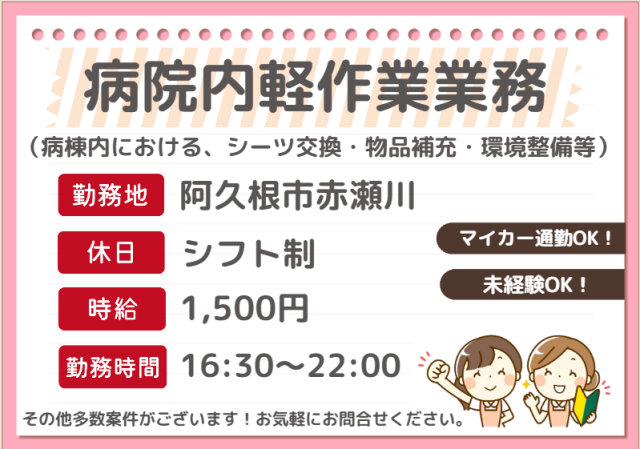 勤務時間 16:30~22:00 軽作業スタッフ ☆幅広い世代の方活躍中 ☆ お仕事されている8割の方は 無資格・未経験から始められています。 専任の担当者が仕事のご案内から、 就業スタート以降もフォローアップ行います。 ・資格支援制度 ・友人紹介制度 ・健康診断(当社規定有) ・給与前払い制度有(当社規定有) ・有給休暇 ・各種保険制度有