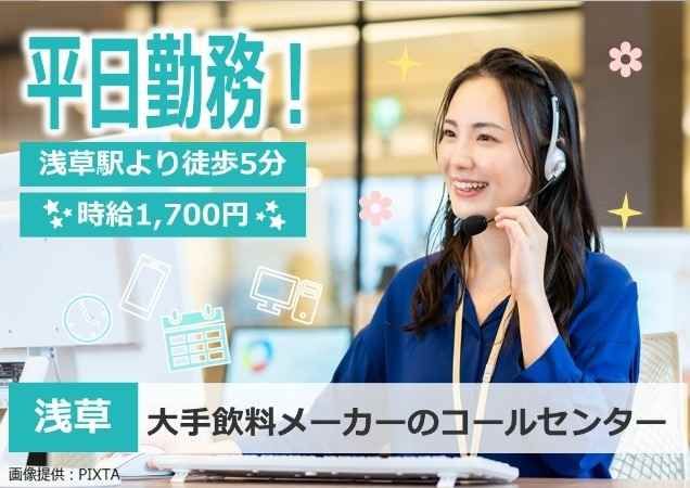 PRコメント ◆人気エリアのおしごと 好立地!浅草駅より徒歩5分 本所吾妻橋も利用できるので便利です! 終業後にショッピングをしたり、 カフェでホッと一息ついてリフレッシュもできます♪ ◆高時給×長期のおしごとで安心★ 研修中から高時給の1,700円でスタート! 高時給だからモチベーションにも繋がります♪ 交通費も別途支給なので余計な出費はかかりません! ◆土日祝休み 平日のみのオフィスワークだから、 家族や友人との予定も合わせやすい! シフト勤務だと予定を合わせるのも一苦労だったりしますが、 そんな心配はご無用です! ◆残業ほぼなし 17:00終業で定時退社可能! お子様がいる方や、終業後に習い事など趣味の時間に使いたい! といった方にもオススメです◎ ◆服装自由 清潔感があればいつも通りの服装でOK♪ 派手過ぎなければ茶髪・ネイルもOK! ◆職場環境充実 社員食堂では500~700円ほどでランチが楽しめて節約もできちゃう! 冷蔵庫・電子レンジが完備された休憩室もあるのでお弁当派も困りません。 【仕事内容】 【大手飲料メーカーのコールセンター】 飲料メーカーの商品(主にビール等の酒類)についてのお問合せやご意見を 電話とメールにて受け付けます。 お問合せに対しての調査結果をお客様へ電話やメールにて報告します。 <お問い合わせ例> 「成分について教えて欲しい」 「販売店舗を教えて欲しい」 「変な味がする、消費期限が切れていた」 など ※最初は電話対応がメインですが、いずれはメール対応もお願いします。 他、商品をお送りいただく為の梱包材の準備や送り状の作成、印刷や 社内での業務連絡(チャット)などの付随業務もお願いします。 \CMでもお馴染みの飲料メーカー/ 【店頭で見たことがある】【飲んだことがある】 身近に感じられる飲料のお問合せ対応です★ お客様にもっと商品を好きになってもらえるように、 意識高くやりがいを持ってできるお仕事です♪ その他会社が定める業務 (業務の必要性に応じ本人の同意を得た場合)