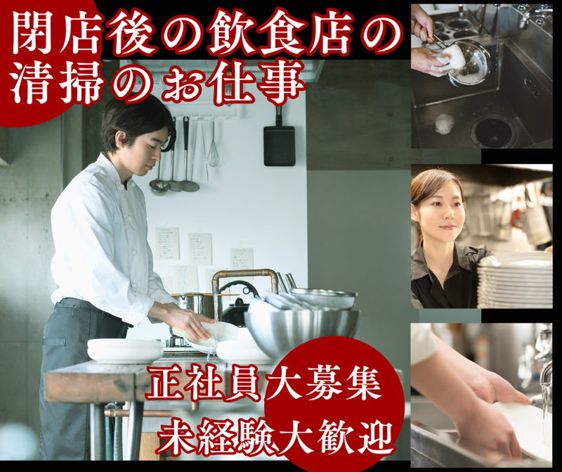 仕事内容 \未経験からスキルアップを目指せます!/ 飲食店をキレイに保つ大切な仕事♪ 正社員【清掃スタッフ】募集! 飲食店の営業終了後に、店舗の清掃を行い 「安心して翌日を迎えられる環境」を整える仕事です。 安定成長を続ける当社で、新しい仲間を募集中! ━━━━━━━━━━━━━ 【具体的な仕事内容】 飲食店を巡回し、 ・厨房や床、テーブルなどの清掃 ・食器洗浄、片付け などを担当。 日頃の家事に近い作業が中心なので、 未経験からでもすぐに慣れていただけます。 最初は先輩が同行し、 流れを丁寧にお伝えするので安心! 【キャリア形成】 スタッフとして経験を積んだ後は、 リーダー、管理職へとステップアップ可能。 長く働きたい方にもピッタリです。 ━━━━━━━━━━━━━ 【こんな方におすすめ】 ☑ 掃除が得意・好きな方 ☑ コツコツ取り組むのが得意な方 ☑ 人の役に立つ仕事にやりがいを感じたい方 成長中の清掃サービスで、 飲食店の“縁の下の力持ち”として活躍しませんか? ━━━━━━━━━━━━━ 【職場について】 スタッフ一人ひとりの声を大切にしながら、 働きやすい環境づくりを進めてきました。 その結果、多くのスタッフが 長く続けてくれています! 柔軟なシフトやサポート体制が 整っているため、 長く安心して働けます。 「安定」も「やりがい」も 両方手に入る環境です。 ━━━━━━━━━━━━━ 【社員インタビュー】 ◆本部スタッフ(30代) 前職はホテルの料理人。 コロナ禍で勤務先が閉館となり、 転職を決意しました。 「飲食に関わり続けたい」 という想いから当社に入社。 最初は戸惑いもありましたが、 様々な店舗や人と関わる中で 刺激的な毎日を送っています。 基本的に1人で作業するため、 人間関係のストレスも少なく、 集中して働ける環境。 さらに、頑張りを しっかり評価してもらえるので やりがいを感じています。 「ありがとう」の言葉をいただけるたびに、 この仕事を選んで良かったと実感しています。 ━━━━━━━━━━━━━ ※勤務地は契約先になります