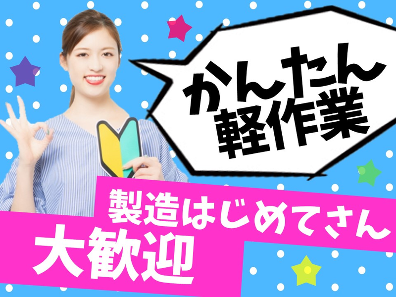 ■仕事内容 【仕事内容】 軽量内装部品の製造 ①機械に製品をセット ⓶ボタンもしくは工具を使用して部品はめ込み ②出来上がり製品の目視検査 ③完成品の仕分け 社員の教育指導もフォローも万全です。 ※縫製作業も希望できます。 ■仕事の特徴 車通勤OK バイク通勤OK 髪型・髪色自由 友達と応募OK 即日勤務OK フルタイム歓迎 長期歓迎 平日のみOK 学歴不問 未経験・初心者OK ブランクOK 資格不問