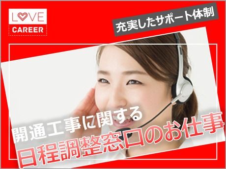 仕事内容 ●派遣先について● 派遣先/駒込駅徒歩10分 千石駅徒歩2分 ●お仕事について● ケーブルTV局を通して光回線サービスを申込みされた方への開通工事日程の調整 ・開通工事日の調整のための架電、折り返し受電対応 ・通信会社の窓口や工事会社との調整連絡 など ●応募資格● <研修充実!未経験大歓迎☆> ◆未経験OK ◆基本的なPC入力ができればOK ●当社について● Love Career(ラブキャリア)は、2012年設立の総合人材サービス企業。ただ単に「人を企業に派遣する」だけにとどまらず、 「人を大切に想い、感謝の気持ちを忘れない」という信念に基づき、私たちにかかわるすべての方が笑顔になれるような社会を目指して、日々進化を続けています。 ★その他にも短期~長期のお仕事たくさんあり★ 詳細は担当へお問合せください。
