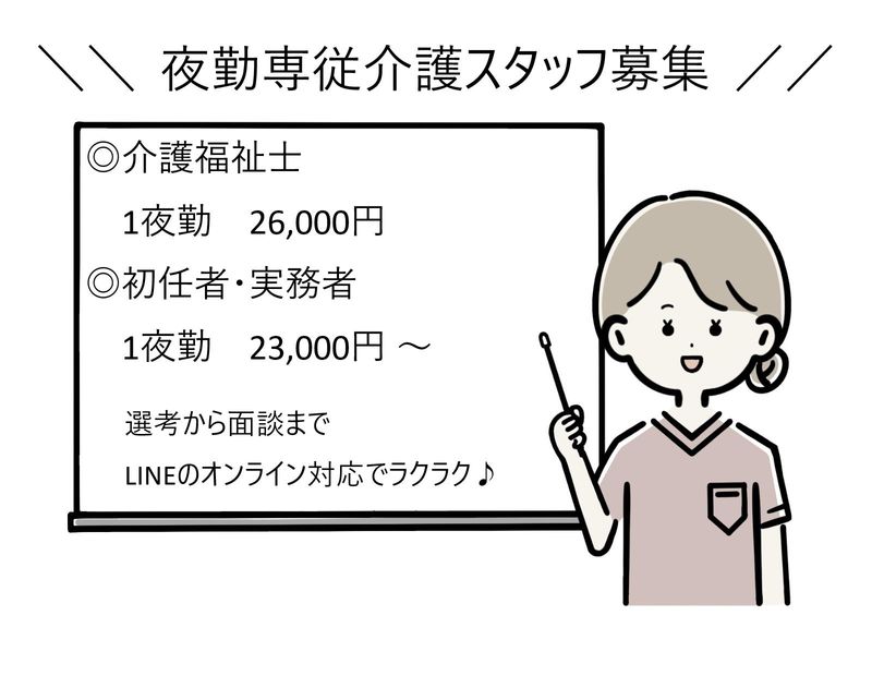 仕事内容 【仕事NO.s_299】 特別養護老人ホームにおける、夜勤業務をお願いします。 食事介助 排泄介助 離臥床 巡回 記録整理(ソフト関係)など