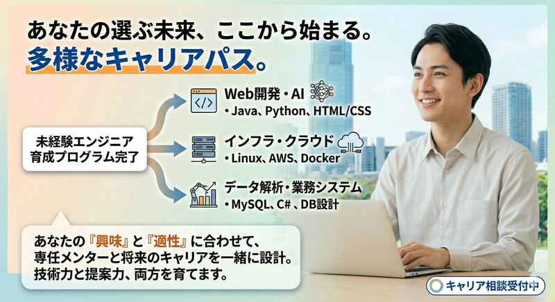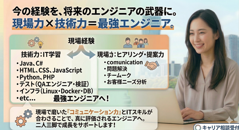 仕事内容 当社では「ただコードが書ける人」ではなく、「現場で信頼され、課題を解決できるエンジニア」を育成しています。そのための第一歩として、以下のプロジェクトからスタートしていただきます。 ■STEP 1:IT基礎・現場実践フェーズ(半年〜1年) プロジェクト内容: * 大手家電量販店等でのスマートフォン販売・プラン提案 PC・モバイル端末のキッティング(初期設定・動作確認) 法人向けネットワーク機器の設置・設定サポート ここで磨く「一生モノのスキル」: ヒアリング力: お客様が「何に困っているか」を正確に聞き出す力。 提案力: 難しいIT用語を使わず、誰にでも分かりやすく説明する力。 完遂力: 決められた納期と手順を守り、正確に作業を終える責任感。 これらは、将来システム設計や開発を行う際、**「顧客の意図を汲み取る最強の武器」**になります。 ■STEP 2:IT専門エンジニアフェーズ 現場で「あなたに任せて良かった」という信頼(評価)を勝ち取り、並行して社内カリキュラムを修了した方から、インフラ構築やシステム開発などの専門案件へ配属します。
