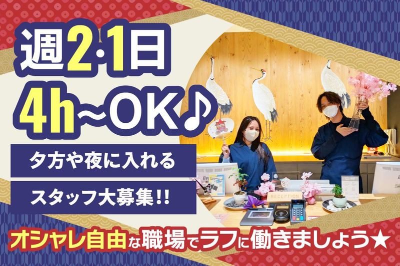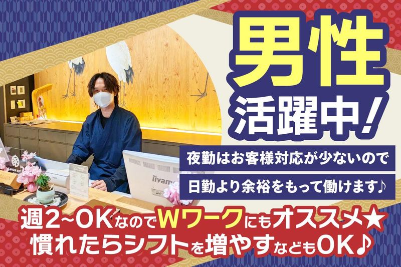 仕事内容 ━━━━━━━━━━━━━━━━━━━ 【 夜勤専属のここが魅力!】 ⭐ お客様対応少なめで落ち着いた雰囲気 ⭐ ルーティン作業中心で未経験も安心 ⭐ 深夜手当で効率よく収入アップ♪ ━━━━━━━━━━━━━━━━━━━ ✅ 未経験・バイトデビューも歓迎! ✅ 英語に抵抗がない方なら大丈夫! ✅ おしゃれOK!堅苦しさゼロ♪ ✅ 学生さんが中心のフレンドリーな職場 ✅ 週2日だけ、4hだけでもOK! ✅ 平日だけ、土日祝だけも◎ ━━━━━━━━━ ◆ 仕事内容 ◆ ━━━━━━━━━ 大阪・難波の中心にある和モダンホテル 『KAMON HOTEL NANBA』 にてフロントスタッフを募集します! 9割が外国人のお客様という グローバルな環境ながら、 夜間は来客対応が少なく、 落ち着いて働ける環境です◎ 仕事内容はとってもシンプル! * チェックイン・チェックアウト対応 * 予約内容の確認や変更手続き * 電話でのお問い合わせ対応 * 近隣スポットや観光地のご案内 など 深夜帯はお客様の出入りが少なめで、 ルーティン業務が中心! 丁寧な研修&先輩のフォローもあるので、 未経験でも始めやすい環境です♪ ━━━━━━━━━━━ ◆ 職場の雰囲気 ◆ ━━━━━━━━━━━ ✨ 宿泊者の9割が外国人観光客 ✨ 残り1割はファミリー層 ✨ スタッフは学生8名、社員3名 ✨ 10代、20代、30代、40代が活躍中 スタッフ同士の距離が近く、新人さんも スグに馴染めるあたたかい雰囲気◎ お客様対応も自然体でOK! かしこまりすぎない、 フレンドリーな接客スタイルです♪ 語学に興味がある方なら、 日々お客様とふれあううちに 自然と英語や中国語の簡単なフレーズを 覚えられますよ! 受付での会話の流れは大体決まっているので 比較的覚えやすいと思います◎ \ こんな方にピッタリ!/ ・語学に自信はないけど興味はある ・海外の方と話してみたい ・話しやすい雰囲気の職場が好き ・同年代の仲間と楽しく働きたい ・かっちりした雰囲気が苦手 ━━━━━━━━━━━━━━━━ ◆ こんな働き方が叶います ◆ ━━━━━━━━━━━━━━━━ フルタイムでがっつり稼ぎたい方も、 本業終わりにサクッと稼ぎたい Wワーカーの方も、みんな大歓迎♪ < シフト例 > ・22:00~7:00 ・22:00~2:00 ・23:00~6:00 など、1日4h~勤務OK! 曜日・日数はお気軽にご相談ください◎ 生活スタイルに合わせて無理なくスタート! 将来的には社員登用のチャンスも♪