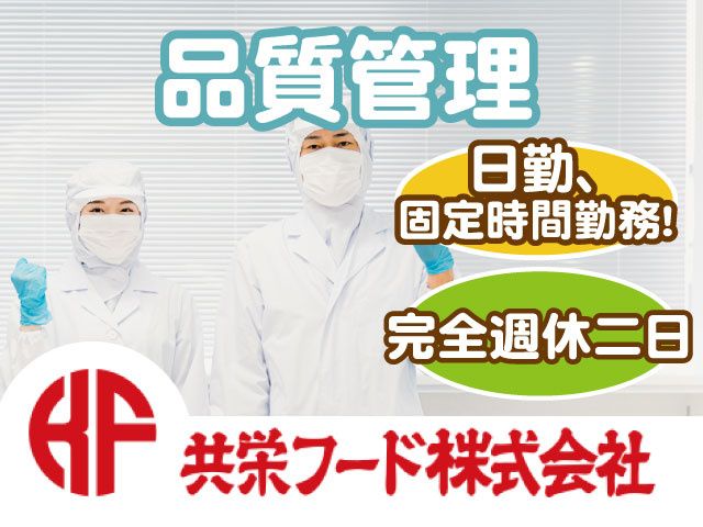 仕事内容 日曜定休の完全週休二日制! 準社員勤務でしっかり稼げる パン粉製造工場で品質管理のお仕事! 創業50年以上の安定企業で 一緒に働きませんか? <ポイント> ・食品製造業、食品加工の未経験OK! ・8hのしっかり勤務! ・日勤のみのお仕事だから 子育て世代も働きやすい! ・フリーターの方ももちろんOK! ・日曜定休の完全週休二日制! ・20代、30代 ミドル、中高年活躍中! ・主婦さん活躍中! 【募集職種】 準社員/食品製造の品質管理(検査業務) <仕事内容> 自社で製造するパン・パン粉の 品質管理(検査業務)をお願いします。 【 詳細 】 ・主に製造したパン粉の検査に関する業務を行ってもらいます! (菌検査、アレルゲン検査、水分値測定など) ・衛生業務 (作業着や身だしなみ、毛髪チェック、工場内巡回、工場内製造品のサンプル回収など) ・簡単なエクセル操作 (記録の入力など) ・その他付随業務 など。 ※本人との合意の上、 別職種への変更の可能性あり <しっかり働きたい方もOK> こちらの勤務は日勤のみ! 工場勤務に多い交替制勤務でなく、 日勤のみで1日8h、週5日、 完全週休2日でしっかり働けます! お子様が大きくなってきて 手が離れてきた主婦(夫)の方にも オススメのお仕事です。 < 未経験歓迎 > 未経験でもOKです。 やる気があって、元気がある方 ぜひ一緒にお仕事しませんか? < 待遇・福利厚生充実 > 社会保険完備、昇給年1回、 各種手当、制服貸与など 準社員勤務(パート・アルバイト含む)の方の 待遇、福利厚生にも力を入れています。 <働きやすい職場環境> お弁当を注文して食堂で食べられます! 休憩室もありますので 休憩時間はリラックスして過ごせます。 <長期安定して働けます> 当社は創立以来、業績を伸ばし続け、 国内外に多数の拠点を有します! 業界トップクラスのシェアを誇り、 常に需要があるため、 景気にも左右されにくく、 長期安定でお仕事ができます! また、正社員登用制度もあるので 将来性もバッチリです! <その他にもお仕事あり!> その他の求人募集はコチラ ↓ ↓ ↓ ↓ ↓ https://entori.jp/kyoeifood_kitakanto <当社について> わたしたち共栄フード株式会社は 創業1967年以来、50年以上、 「パン粉」という食材を通じ、 日本および世界の「食」に 貢献して参りました。 詳細はHPをご覧ください! https://www.kyoeifood.co.jp/