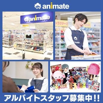 仕事内容 アニメイト店頭でのレジ業務を中心に、接客・品出し・商品陳列などの店内業務を担当していただきます。 最初はできるところからお任せしていき、徐々に業務の幅を広げていきましょう。 書籍やグッズ、オーディオ関係…作品ごとに無数の商品がリリースされ、絶えず新商品が入荷する店舗は、まさに《スキ》なものしかない空間。お仕事だって楽しくなくちゃ! 《長期できる方大歓迎!》まずは明るい挨拶ができれば、店頭での接客やレジのお仕事未経験でも大丈夫です★ スタッフは、男女ともに大学生やフリーターの割合が多いです。勤務日数や勤務時間も相談OKですので、プライベートの予定をきちんと考慮しながら働けますよ。 《昇給のチャンスあり!》頑張りをしっかり評価し、給与に反映するシステムが整っています。 交通費も支給(上限有り)されるので、毎日の通勤も安心。 また、社員登用制度があるので、「仕事を通してアニメやゲーム業界をもっと盛り上げたい」「将来を見据えて仕事を探している」という方にもピッタリです。 一緒に働くスタッフ同士、好きなアニメやマンガの話で盛り上がれる!時にはお客様と語り合うことも…。 「このキャラ私も好き!」「これってどういう作品なの?」趣味を通して仲間同士打ち解けやすい空気がいい!共通点があると盛り上がれるから、初めての環境にもすぐに馴染めますよ。 頼れる先輩も多いので、未経験でも安心。もちろん経験者は優遇! アニメのことならアニメイト!という知名度が強み。アニメ・マンガ・ゲーム業界を最前線で盛り上げます。 株式会社アニメイトは、日本最大級のアニメショップチェーン店。全国に120店舗を構え、書籍やグッズの販売だけでなく、グッズの企画、制作、関連イベントの企画運営等、幅広い事業を展開しています。