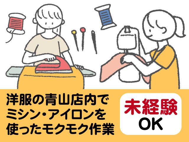 仕事内容 1日6時間、週2日~できるお仕事! 扶養内勤務可 接客したりする事はありません。 きれいな職場で自分のペースで 集中して取り組める環境です。 コツコツと丁寧な作業が出来る方なら ピッタリですよ! 「洋服の青山 茨城鹿嶋店補正室」内で スーツ等の補正・寸法直しのパートさん募集! ミシンを使って 袖丈・着丈・裾上げなどの調整を行い、 アイロン掛けを行います。 いろいろな種類の服のなかでも、 スーツは特にサイズに こだわるべき服装であるといえます。 お客様の身体にジャストフィットする スーツを仕立てるお手伝いしてみませんか? “衣類の修繕”や“すそ直し”といった作業や、 ミシンの使用経験あれば、スキルを活かせます! 「以前は洋裁に触れてたけど、最近は・・・」 というブランクのある方や、 まったくの未経験であっても 研修期間があり、マンツーマンで丁寧に 指導するので、ご安心ください! 30代・40代・50代の女性が活躍しています。 勤務日数は週2日~ご相談ください。 同じ曜日に働くことが難しい方も大丈夫。 ご希望をお聞きします。 主婦さんも活躍中! 子育て・家事との両立がしやすい仕事です。 日曜・祝日に勤務できる方優遇いたします。 ▼勤務地 洋服の青山 茨城鹿嶋店 補正室 茨城県鹿嶋市宮中311番地1 駐車場完備で車通勤可能。 交通費別途支給いたします。 近くに大型スーパー、 ショッピングセンターもあり、 夕食のお買い物にも便利です。 ▼応募について WEBからお気軽にエントリー可能です。 追って面接日等お知らせいたします。 面接は勤務地にて行います。 面接の際は履歴書(写真貼付)持参下さい。 興味のある方はぜひご応募ください!