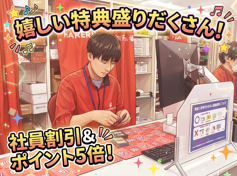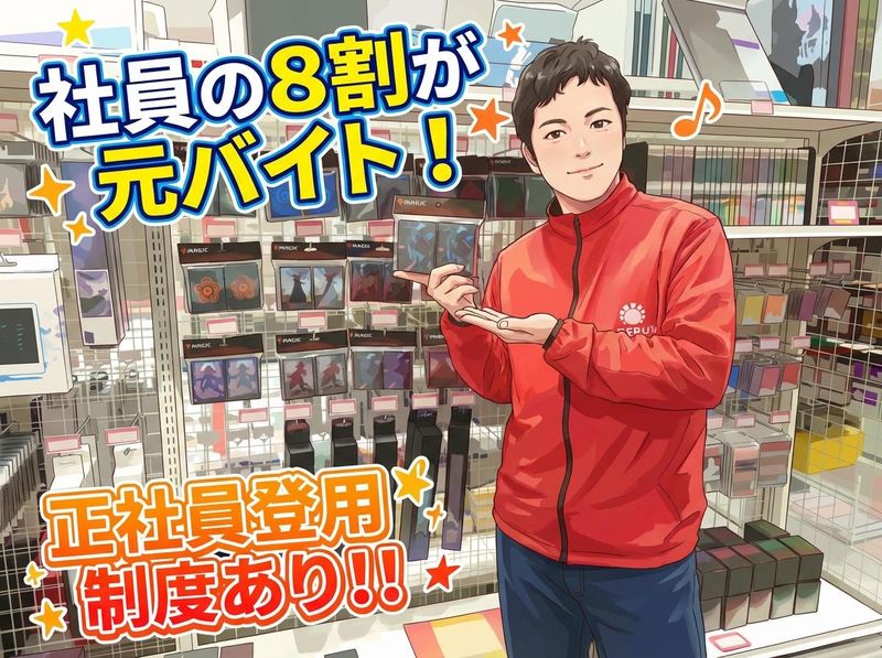 求めている人材 ✅接客・販売未経験OK ✅トレカ経験不問・知識不問 ✅トレカ好きな方も大歓迎! ✅学生歓迎 ✅フリーター歓迎 ✅主夫・主婦歓迎 ✅Wワーカー・副業ok ✅第二新卒歓迎 ✅学歴不問 ✅未経験歓迎 ✅バイトデビュー歓迎 \こんな方、大歓迎!/ ・トレカが好きな方 ・人と話すのが好きな方 ・チームでの作業が好き ・活気がある、明るい職場で働きたい ・新しいことに興味がある ・販売・接客の仕事に興味がある ・近い年代のスタッフと働きたい ・いずれは正社員として働きたい ・土日に多くシフトに入りたい …など \こんな経験も活かせる/ ・コンビニや飲食店等での「接客・販売」 「商品の品出し」「商品整列」 ・倉庫や製造現場での「軽作業」 ・店舗運営やマネジメントなど「リーダー」…など