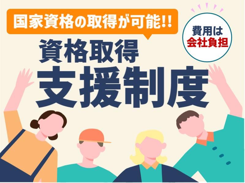 【保険制度】 雇用保険、労災保険、健康保険、厚生年金 待遇・福利厚生 【福利厚生】 ・社会保険完備 ・交通費規定支給 ・昇給あり ・賞与あり(年2回) ・退職金制度 ・作業服貸与 ⇒夏:空調服の貸与OK ・資格取得支援制度 ・休憩所あり ・車、バイク通勤OK ・駐車場完備 ・家族手当 ・育児休暇 ・介護休暇 ・各種手当あり