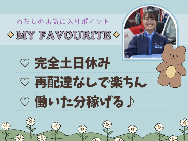 仕事内容 _____________ ヨシケイのお仕事のポイント  ̄ ̄ ̄ ̄ ̄ ̄ ̄ ̄ ̄ ̄ ̄ ̄ ̄ ★子育て世代のお母さんが中心に活躍中 子育てママ(パパ)さんが働きやすい 職場・福利厚生を整えています◎ ★土日休み!日勤9:00~16:00まで ★オートマ軽自動車での配達 普通免許(AT限定可)だけで始められて、 軽自動車なので運転が心配な方も安心♪ ★まずは見学して説明を聞きたい!もOK ご希望の方はお電話(0120-377-714)まで。 そのまま面接選考の調整も可能なので、 ご希望される場合は履歴書をご準備ください! ______________ 宅配・販売スタッフの仕事内容  ̄ ̄ ̄ ̄ ̄ ̄ ̄ ̄ ̄ ̄ ̄ ̄ ̄ ̄ 軽自動車で夕食材料セット(ミールキット)を お客様のご自宅に配達していただくお仕事です。 食材はヨシケイの専用BOXで配達し、 次回の配達時に前回のBOXを回収します。 なので、再配達でバタバタすることもなし! 新しく注文を受けたり、集金・事務などもありますが、 最初は先輩の車に同乗しながら仕事を見学し、 皆さんの運転にも先輩が同行していきます。 独り立ち後も事務所での休憩時間に みんなで雑談しながら聞いたりできるので、 未経験の方でも安心してください。 また、商品案内として 新しいお客様へのチラシ配布や 既存のお客様への商品の ご紹介をお願いします。 既存のお客様の相談にのったり、 生活にあった食事の提案をしたり、 ただ配達するだけではないところがやりがいポイント! 人との会話を楽しんだり、「いつもありがと~」 という言葉でやる気が出るタイプの方にピッタリです。 「自分の生活にあった働き方はしたいけど ただこなすだけの仕事は飽きるしなあ…」 そんな思いで仕事探しをしている方は、 ぜひ一度見学にきてみてください! ________ こんな方が活躍中  ̄ ̄ ̄ ̄ ̄ ̄ ̄ ̄ ★20~40代の女性スタッフが中心に活躍中! 産休・育休制度を利用し、復帰率も90%以上。 産前産後で仕事を探す不安が少ないことや、 ご自身・子どもの体調が理由のお休み(早退)も スタッフのほとんどが女性なこともあり、 会社ぐるみでサポートしあえる環境です。 < 1日の業務の流れ(※一例) >  ̄ ̄ ̄ ̄ ̄ ̄ ̄ ̄ ̄ ̄ ̄ ̄ ̄ ̄ ○清掃 ▶気持ち良い一日のスタート! ○朝礼 ▶仲間たちとミーティング! ○積み込み ▶ミールキットをヨシケイCarへ ○出発 ▶お客様のところへ訪問し 食材のお渡し、 注文や集金など業務! ○帰社 ▶片付けや事務処理作業 ○退社 ▶お疲れさまでした! ✅9:00~16:00迄(実働4~7時間位)  ̄ ̄ ̄ ̄ ̄ ̄ ̄ ̄ ̄ ̄ ̄ ̄ ̄ ̄ ̄ ̄ ̄ ●週休2日(土日休み) ●祝日(月~金)は出勤になります ★子供が急に体調を崩した... ★どうしても外せない用事がある... こんな急な勤務変更にも 対応可能な職場です! *毎週土日休み!家庭と仕事の両立可能!* 「お仕事は任せて!」 「ゆっくりしてきてね!」 そう言ってくれる スタッフばかりなので安心! アットホームな雰囲気が 特徴的な素敵な職場です♡