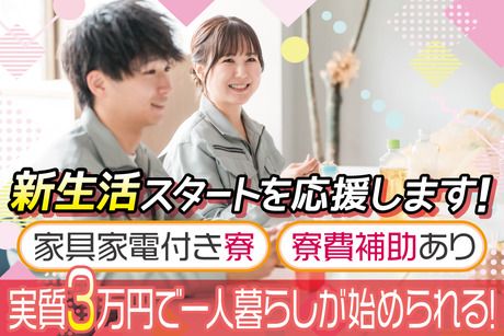 仕事内容 【未経験から収入も生活も安定させたい方へ】 ●月収30万円可 → 毎月しっかり貯金できる収入 ●寮完備(ワンルーム/家具家電付き) →家賃平均6万円程度のところ、 補助3万円ありで実質約3万円+光熱費 →初期費用を抑えて一人暮らしスタート可能 ●大手メーカー勤務 → 長く働ける安定環境 ●土日休み → プライベートの時間もしっかり確保 ●姫路駅徒歩10分&車通勤OK → 通勤ストレス少なめ 【急募のため、入社祝金キャンペーン実施中】 4月1日~6月30日の間に入社された方に 祝金10万円を支給します!(規定有) \募集枠が埋まり次第終了!/ 「そろそろ転職しようかな…」という方は今がチャンスです。 【オシゴト内容】 大手メーカーでの製造サポートのお仕事です。 作業はとてもシンプルで、 未経験の方でも始めやすい内容です。 ▼具体的には ・部品をセット ・ボタン操作で加工 ・完成品のチェック この3ステップが基本です。 機械が中心に作業を行うため、 難しい工程はほとんどありません。 コツコツ作業が得意な方に向いているお仕事です。 ※立ち作業が中心となります。 【長く続けられる理由】 勤務先は大手メーカーの工場。 自動車に使われる機器を製造しており、 安定した需要があります。 定着率が高く、長く働くスタッフが多いのが特徴。 また、直接雇用へステップアップした実績もあり、 将来を見据えて働きたい方にもおすすめです。 【職場環境】 職場は空調完備で、季節を問わず快適。 休憩は1日3回あり、無理なく続けられる環境です。 20代~40代の男女スタッフが活躍中。 男女比は約8:2で、未経験スタートの方も多数在籍。 落ち着いた雰囲気で、コツコツ作業に集中できる職場です。 【しっかり稼げて生活も安定】 月収例:約30万円 (内訳) ・時給1350円×19日勤務 ・深夜手当/残業・休日出勤 →深夜帯は時給1688円で効率よく収入UP 「月収30万円前後」+「寮費実質約3万円」 ・貯金もできる ・一人暮らしでも余裕あり ・趣味にもお金が使える 収入も生活も、どちらも安定させたい方におすすめです。