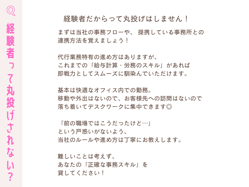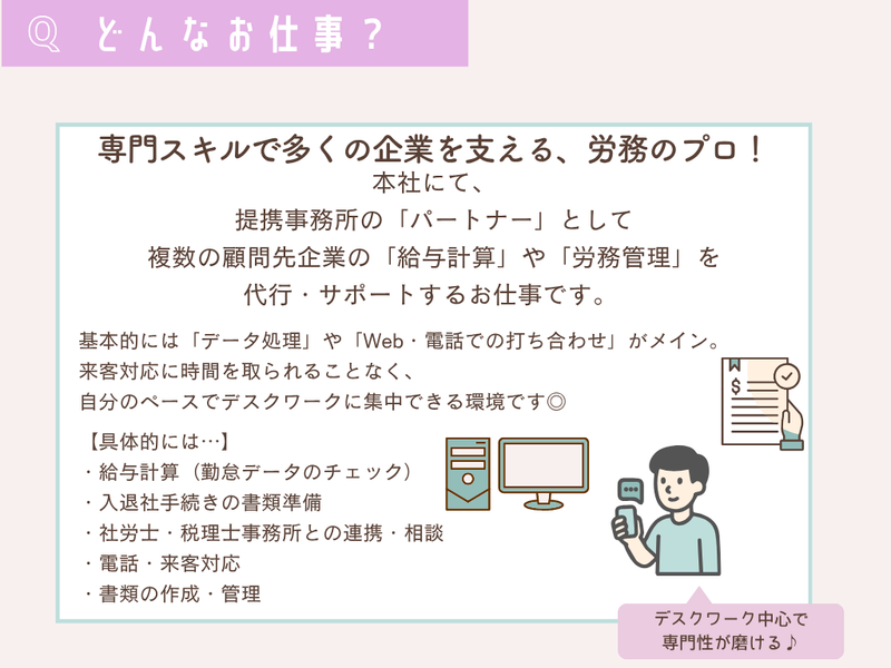 求めている人材 【必須条件】 ・総務事務経験がある方 ・給与計算の実務経験がある方 ・PCの基本操作(Excelへの入力・簡単な計算)が円滑にできる方 【歓迎するスキル・志向】 ・労務管理の実務経験がある方 ・社労士事務所とのやり取り経験がある方 ・数字に対して責任感を持ち、コツコツと正確に作業を進められる方 ・専門性を磨き、バックオフィスのプロとして活躍したい方