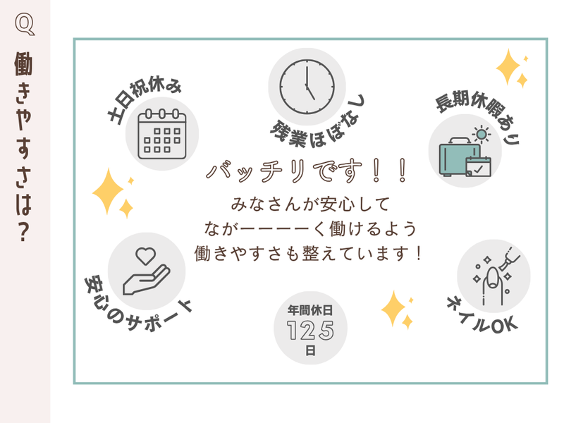 職場環境 \働きやすさ◎/ 「家族との時間も大切にしてほしい」 そんな想いで、職場作りに本気で取り組んでいます。 より働きやすい環境であなたの経験・スキルを活かしませんか? ✅残業ほぼナシ! ✅服装・髪型・ネイルも自由でおしゃれも楽しめる♪ ✅有給取得率100% 喫煙所:なし(敷地内全て禁煙)