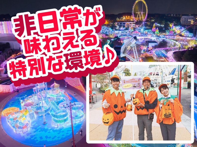 求めている人材 <必須条件> 土日祝日を含む週2日以上勤務できる方 繁忙期に勤務が可能な方 屋外で体を動かす勤務が可能な方 ※寒さや雨などの天候面や虫などに ある程度ご理解ある方 *2026年3月卒業予定の進路が決定している高校3年生は可 <こんな方、歓迎します!> 大学生、専門学校生の方 フリーターさんや 「遊園地で働いたことがない…」 といった未経験の方も歓迎します!