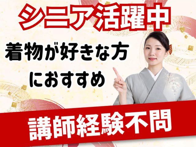 仕事内容 【50代~70代の女性が活躍中!】 典雅きもの学院スタッフ募集! 「家事の合間に」「スキマ時間に」働きやすい! 週1回~、1日120分~勤務OK! 【お仕事内容】 初心者(ふれあい)コースの先生として 生徒さんが一人で着物を着られるように 指導をお願いします。 「着物を着る機会を増やしていこう」 「楽しい仲間ができる場所だ」 「着付けって楽しい」 生徒さんにそう感じていただけるよう 丁寧な指導をお願いいたします。 ミドル・中高年・シニア世代が多数在籍! 着付けの経験があれば講師未経験者もOK! 【週1回~、1日120分~勤務可能!】 Wワークとしてもおすすめです。 ライフスタイルに合わせて 勤務時間や日数はお気軽にご相談ください。 希望休の取得もOK! 子育てが少し落ち着き、時間が出来始めた方や 今後長く続けられる事を新しく始めたい方など 講師未経験から始めた ミドル・中高年・シニア世代も活躍中です。 【流派は不問です!】 着付けの講師経験がない方もぜひご応募ください。 一から丁寧に指導いたします。 講師経験がある方は知識・スキルを活かして ご活躍いただけます! 【こんな方におすすめ!】 ・着物が好きな方 ・子どもの着付けをしたことがある ・自分で着付けができる ・家事や育児の空いた時間で働きたい主婦(夫)さん ・子育てが落ち着いたからまた仕事がしたい 近年、着付けができる方が減少傾向にあります。 着付けの流派にとらわれず、着物が大好きで 着物の魅力を伝えたい、そのようなお考えの方は ぜひ、一緒に日本の大切な文化を広めていきませんか? 生徒さんが一人で着られるようになれば、 その喜びを一緒に感じられるやりがいあるお仕事です。 現在、50代・60代・70代の女性が多数活躍しています。 着物が好きな方、着付けを覚えたい方など ご応募お待ちしております!