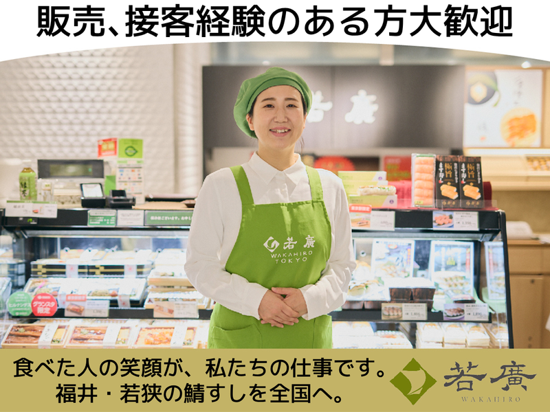 仕事内容 \⭐春の新スタッフ増員募集⭐/ JR東京駅改札内(グランスタ東京 B1F) でアクセス便利♪ 初めてのアルバイトの方も大歓迎♪ 職場見学も実施中♪ ※採用者が決定次第、募集締め切りです。 ╭──────────・⭐・・─── 福井名物を扱う販売のお仕事です♪ テレビや各種メディアで紹介された 人気商品‼お得に買える社割もあり♪ ✨⏩0770-53-3844 (採用担当:永島)まで 電話でのご応募や、 お仕事内容のお問い合わせも大歓迎♪ ╰─・・⭐・──────────── <お仕事内容> ⏩接客販売・レジ(バーコード読み取り) ⏩商品の陳列・補充・在庫チェック ⏩試食のご案内や商品の説明(販売接客) ※包装済みの焼き鯖すしやお弁当を レジ業務と袋に入れてお客様に お渡しするシンプルな業務です! 難しい業務は一切ございません! ✅未経験の方も安心♪ 商品や接客を学ぶ座学研修を 初日に実施いたします。 初めてのアルバイトの方も 丁寧にサポートします! ✅学業やプライベートとも両立OK♪ 17時以降の夕方・夜シフトのため、 学校帰りの学生さんやWワークで働く フリーターさんにもおススメです。 駅の改札内なのでアクセスも便利! 月1の希望シフト制なので、 学校やプライベートに合わせて働けます。 ┏━━━━━━━━━━━━━━┓ 頑張りや成長を後押しします! ┗V━━━━━━━━━━━━━┛ ⭐お店をよくするアイデアは大歓迎♪ 頑張りは昇給などでしっかり評価します。 ⭐正社員登用制度もあり、 ゆくゆくは正社員として 店舗運営に携わることも可能です。 現在も正社員枠がございますので、 入社後のスピード昇格も実現可能です。 ༶ ༶ ༶ ༶ ༶ ༶ ༶ ༶ ༶ ༶ ༶ ༶ ༶ ༶ ༶ ༶ ༶ ༶ 株式会社若廣は、 空弁ブームのきっかけとなった 「焼き鯖すし」を手がけ、 全国の百貨店催事にも数多く出店しています。 焼き鯖すしをはじめ、 北陸名産の鱒の寿しや、 北陸の風土を感じる 柿の葉寿しなど、 若狭の食文化を全国へ 届けたいという想いから 誕生したブランドです。 『いつもそばに、もっと鯖に。』 この言葉を大切に、 今では全国に目を向け、 各地の食と向き合い、 新たな味を生み出しながら、 皆様に特別な『幸』を お届けし続けています。 【採用担当より】 従業員の皆さんが プライベートと両立が出来るよう、 シフトの柔軟性は特に大切にしています。 家庭や学校と両立出来る働き方を 一緒に考えていきますので お気軽にご相談ください。 仕事内容も とてもシンプルで簡単な業務ばかりです。 自分に出来るかな、、、 そんな不安をお持ちの方も まずはお話だけでもご連絡をお待ちしております。 【HP】 ・✦https://www.wakahiro.co.jp/✦・