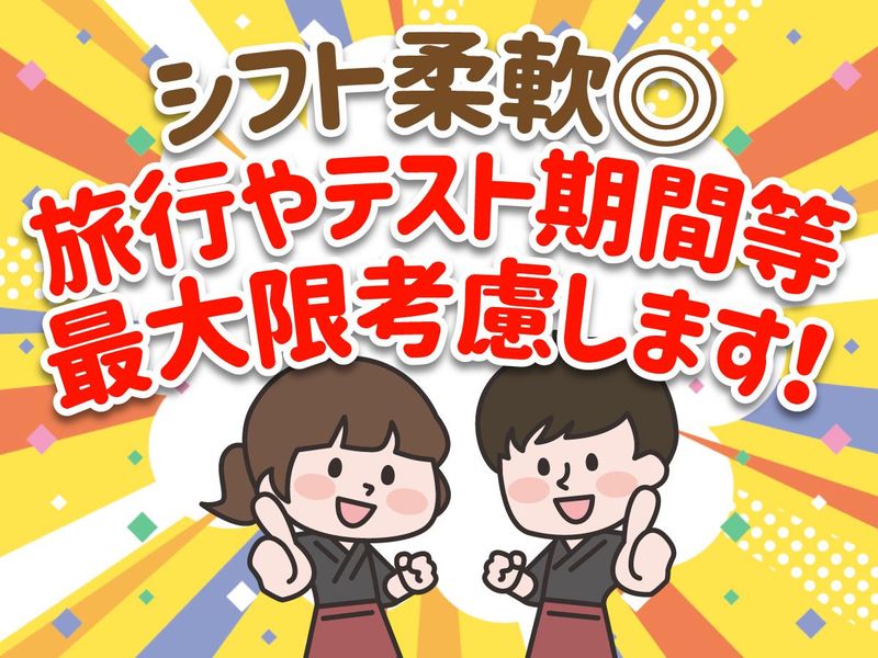 勤務時間詳細 17:00~1:00 ★週2日~/1日3時間~OK ★学校やWワークと両立可能◎ ・テストや実習、大会など事前に予定が 分かり次第教えていただければ調整します! ・「この期間はシフトを減らしたい」 「沢山入ってこんだけお金が欲しい!」 などもOK♪ 店長が調整したり、時にはスタッフ同士 で協力して調整しております* 学校やプライベートと両立しやすい シフトを組むように心がけています。 無理せず、長続き出来るような働き方で 大丈夫です!