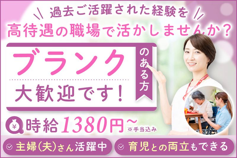 求める人材: 【必須】 ・介護職員初任者研修(ヘルパー2級) ・介護経験 ◤下記に当てはまる方必見◢ ・30代/40代/50代のミドル世代も活躍中 ・ブランクからの復帰を目指したい方 ・スキルアップしたい方 ・安定した環境で長く働きたい方 ・休みが取りづらいと悩んでいる方 ・キャリアの幅を広げたい方 ・無理のない働き方をしたい方