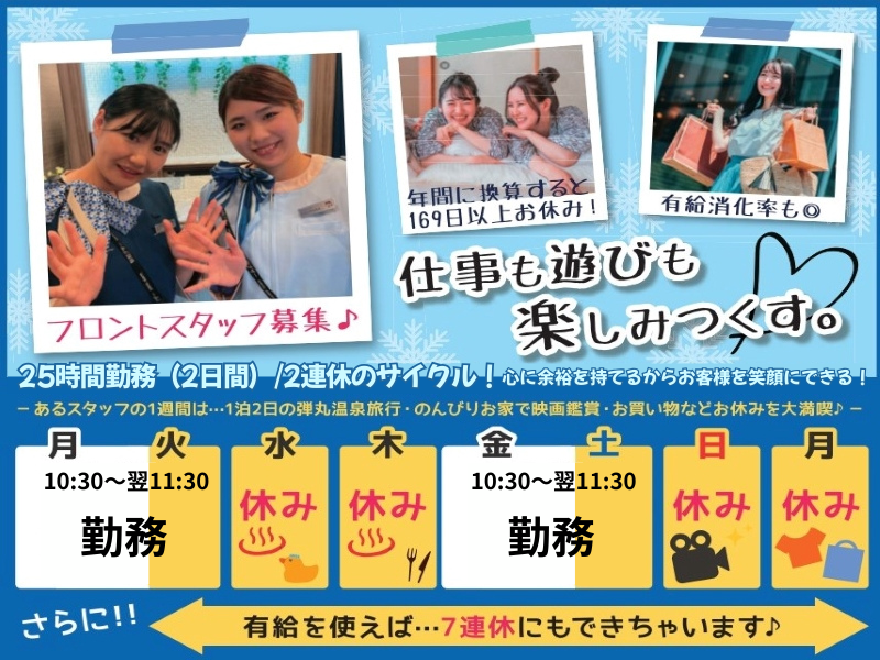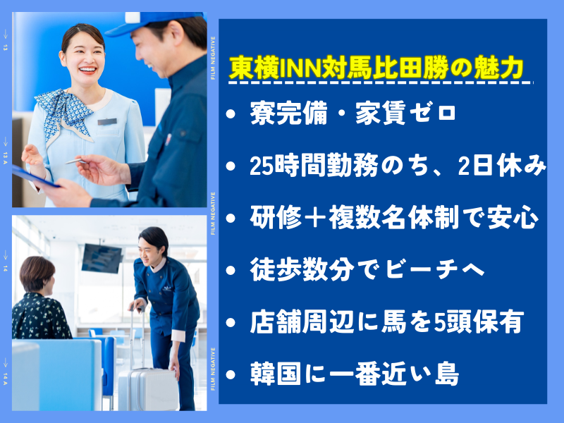 仕事内容 寮費ゼロ。出勤は週2回。 / 朝は鳥の声と潮の香りで目が覚めて、 夜は星空の下で深呼吸。 そんな暮らしが“今”できるって、想像していましたか? \ ✔ 家賃完全無料の寮あり(エアコン付き) ✔ 25時間勤務(2日間)→2日休みのサイクル ✔ 静かな島で、穏やかに暮らせる正社員のお仕事です ―――――――――――――――――――――――――――― 【お任せするお仕事】 ホテルフロントスタッフとして、以下の業務をお任せします。 ■宿泊予約の受付(電話・Web) ■チェックイン/チェックアウトの対応 (自動チェックイン機あり) ■簡単な館内巡回・備品補充 ■ロビー清掃 ■日報の入力など(PC操作) ✨お客様との“ちょっとした会話”がやりがいになるお仕事です。 お客様の多くは年配の観光客の方。 騒がしい接客ではなく、 ゆったりと丁寧にお迎えする接客が求められます。 自動チェックイン機があるため、複雑なオペレーションはなし。 その分、お客様と目を見て話す時間を大切にしています 未経験でも、充実研修+OJTでサポートします。 現場は複数名体制なので、なんでも聞ける環境です! ―――――――――――――――――――――――――――― \\大手ホテル×島のホテルだからこその魅力!// ⏩ゆとり重視の正社員生活  ̄ ̄ ̄ ̄ ̄ ̄ ̄ ̄ ̄ ̄ ̄ ̄ ̄ ̄ ̄ ̄ ̄ ̄ ̄ ̄ ̄ ・1回の勤務は「25時間制」(10:30〜翌11:30) ・仮眠3時間+休憩2時間15分あり(合計5時間15分) ・勤務後は2日休み ・年間休日169日以上(実質1年の半分が“自分の時間”) 副業・資格勉強・創作活動・自然アクティビティ… “あなたの時間”をとことん大事にできる働き方です。 ⏩完全無料の個室寮あり。家具・家電は、あなたのスタイルで  ̄ ̄ ̄ ̄ ̄ ̄ ̄ ̄ ̄ ̄ ̄ ̄ ̄ ̄ ̄ ̄ ̄ ̄ ̄ ̄ ̄ ̄ ̄ ̄ ̄ ̄ ̄ ̄ ̄ ̄ ・寮費はゼロ ・お部屋:バス・トイレ・キッチン・エアコン付き ※家具・家電はありません(持ち込み・ネット注文OK) ・水道光熱費のみ実費(1万円以下目安) 海まで徒歩数分。 ホテルの裏には、のんびり暮らす馬たち。 スマホの画面越しじゃない、 本物の自然に囲まれた生活が始まります。 最低限の寝具と家電(冷蔵庫・レンジ)さえあれば、 すぐに快適な生活が始められます。 ✅「ミニマリスト的な生活を試したい」 ✅「自分のセンスで部屋を整えたい」 そんな方にも、ちょうどいい“空の箱”をご用意しています。 ⏩職場の仲間は、全員地元出身  ̄ ̄ ̄ ̄ ̄ ̄ ̄ ̄ ̄ ̄ ̄ ̄ ̄ ̄ ̄ 移住して来るあなたを支えるのは、 地元出身のあたたかいスタッフたち。 「ご飯屋さんならここ」 「家具ならこのお店が安いよ」 「困ったら言ってね」 そんなふうに、“島の暮らし”を教えてくれる仲間が、 すぐそばにいます。 人間関係に疲れた方も、 きっと安心してスタートできる職場です。 ▶応募はもっと気軽に!  ̄ ̄ ̄ ̄ ̄ ̄ ̄ ̄ ̄ ̄ ̄ ̄ ̄ ̄ ̄ リモート面接もOK! 現地に来られない方も、 まずは話を聞いてみるだけでも大丈夫です。 移住を検討中の方も、無理なくスタートできます。 「せっかくなら、長く続けられる仕事がしたい。」 「でも、自分の時間も大事にしたい。」 そんなあなたに、 “ちょうどいい”正社員の新しい働き方なんです!