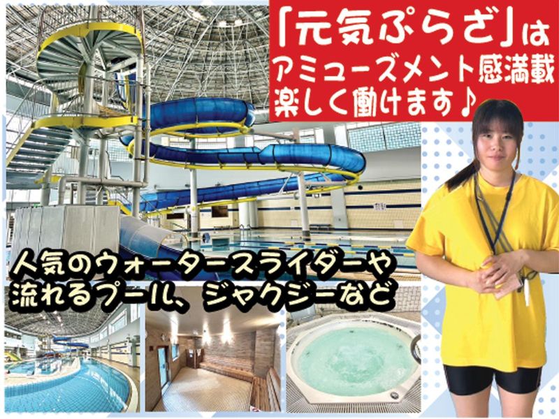 職場環境 元気ぷらざは地域密着型の公共プール! 利用者の方々ともスグに顔なじみに。 大きな窓からは明るい日差しが入り込み とても明るく、25mプールの他に、ウォ ータースライダーや流れるプール、ジャ クジーなどがある楽しい屋内プール。 屋内だから日焼けの心配もなし! 喫煙所:なし(敷地内全て禁煙)