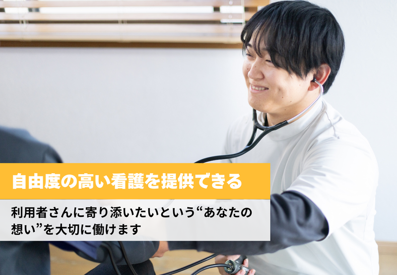 アピールポイント: ・週休3日制/週休2日制など、ライフスタイルに合わせて働けます ・スタッフ同士が穏やかに支え合う、あたたかい雰囲気の職場です ・一人ひとりの「やりたい看護」を大切にしています ・訪問未経験の方も安心してスタートできるサポート体制 ・将来はリーダーや管理者として活躍できるキャリアパスあり