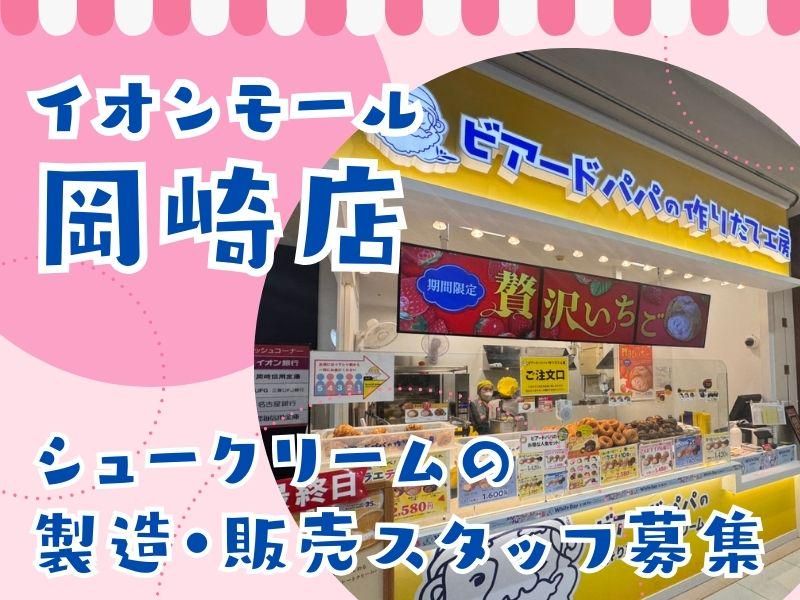 仕事内容 \ 子育て世代の主フさん活躍中 / ✅8:00~13:00の午前中心OK ✅〜17:00までの勤務OK ✅扶養内勤務OK ✅ ブランク歓迎 ✅ 急なお休みも相談しやすい環境 ━━━━━━━━━━━━━━━━━∴★☆ イオンモール岡崎店1Fにある シュークリーム専門店 「ビアードパパ」での接客・販売のお仕事です。 店内で焼き上げたシュー生地に クリームを詰めて販売します。 難しい作業はありません。 マニュアル完備&先輩がすぐ近くでサポートします。 「久しぶりのお仕事で不安…」 という方も安心してスタートできます。 ▼ 具体的には… ・焼きたてシュー生地へのクリーム詰め ・商品のお渡し、接客対応 ・タッチパネル式レジでお会計 ・簡単な準備、片付け レジはタッチパネル式なので操作もシンプルです。 ⭐朝の時間を有効活用できる 基本は8:00〜の勤務。 午前中心(〜13:00)や、〜17:00までの勤務が可能です。 朝からしっかり働いて、夕方には帰宅。 家庭とのメリハリをつけて働けます。 ⭐半月ごとの自己申告シフト制 学校行事・家庭の予定に合わせて調整可能。 急なお休みもスタッフ同士でフォローし合っています。 ⭐買い物にも便利 勤務後にそのまま買い物も◎ 時間を有効活用できます。 ⭐目の前で「ありがとう」がもらえる シュークリームを仕上げて手渡すときに、 お客様の笑顔や「ありがとう」を直接もらえる仕事。 自分の接客で喜んでもらえる瞬間が、やりがいにつながります。