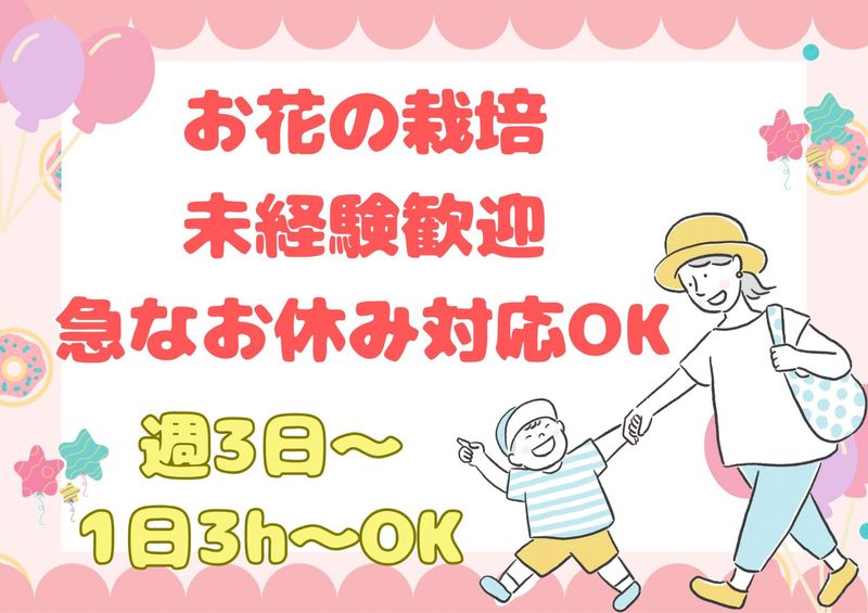 仕事内容: 20代・30代・40代、子育てママ在籍中!急なお休みも大丈夫♪フリーター・フルタイム歓迎☆扶養控除相談OK☆週3日~1日3h~相談OK 【仕事内容】 洋花:サンダーソニア、カラー、マムなどの 栽培や出荷準備が主なお仕事です。 ハウスの中で球根植えや、 お花を束るなど出荷作業の 手伝いをして頂きます。