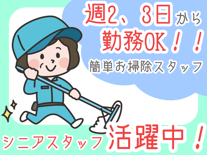 仕事内容 ==おすすめポイント!======== ✅家庭と両立!週2、3日~OK♪ ✅午後のみの短時間勤務で朝はゆったり♪ ✅主婦・シニアスタッフも多数活躍中! =================== ✨週2、3日からの勤務OK!✨ 午前のスキマ時間を有効活用♪ ━━━━━━━━━━━━━━━━━━ 『負担なく安心して働きたい』 『家事スキルを活かしてみたい』 そんな悩みをお持ちの方必見です★ 今回お任せするお仕事は普段、 ご自宅でされるお掃除ができれば 体力に自信がない方でも安心して 勤務いただける清掃のお仕事◎ さらに! 週2、3日から勤務OKですので 体に無理なく続ける事が出来ますよ♪ ⭐未経験スタートのスタッフ活躍中! ⭐Wワーク・掛け持ち、扶養内勤務OK! ・・お仕事内容 ━━━━━━━━ オフィスや工場内の清掃やゴミ拾い等、 簡単でモクモクと取り組める清掃業務を お任せします! ・・具体的には? - ■トイレ・キッチン清掃 ■デスク周りの清掃 ■オフィス内の掃除機がけ ■ゴミ捨て・回収 など 清掃のお仕事が未経験の方も 先輩がフォローするので安心! 難しい作業や力仕事もありません◎ ⭐お子様の急なお休みにも対応OK! ⭐充実の教育制度で安心スタート! ============== スタッフインタビュー ============== ◆先輩スタッフ Aさん もともと掃除が好きだったので、 未経験ながらこの仕事に挑戦して みたいと思いました。 仕事はシンプルですが、 やりがいを感じています! 掃除が好きなこともあり、 楽しく働けています♪ 先輩たちも分からない事は優しく、 丁寧に教えてくれるので、 すぐに仕事に慣れることができました!
