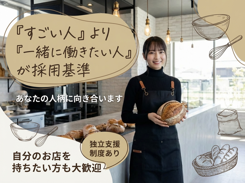 求めている人材 【必須】 • パン製造の実務経験がある方(年数不問) 【歓迎】 • 個人店・ベーカリー・飲食店での製造経験 • 惣菜パン・サンドイッチ製造経験 • 将来、自分の店を持ちたい方も大歓迎です \ こんな方が活躍できます / ・周囲を明るくし、 前向きな雰囲気をつくれる方 ・仲間を大切にし、 チームで協力できる方 ・お客様との会話を楽しみ、 接客にも前向きな方 ・自分で考え、改善や提案ができる方 ・失敗も学びに変え、成長を楽しめる方 < 将来独立を考えている方も歓迎 > さまざまなキャリアを描ける職場環境です。 独立支援として店舗運営のノウハウなども イチから丁寧にお教えします!