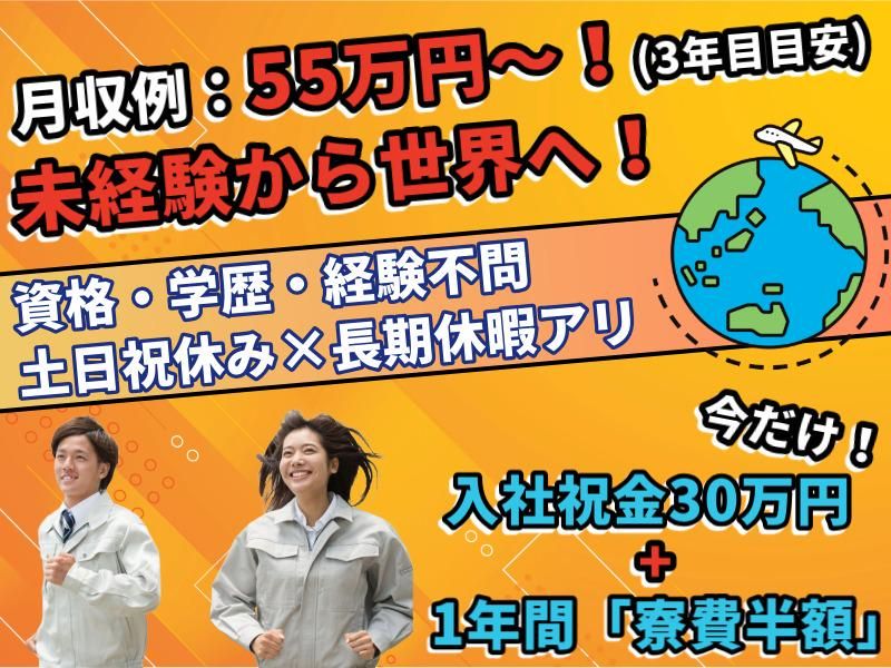 求めている人材 <歓迎> ✅未経験歓迎(経験・学歴不問) ・工場未経験OK ・フリーター歓迎 *第二新卒・ブランクOK *子育てママ在籍中 *男性・女性活躍中 *社会人デビュー歓迎 *20代,30代,40代活躍中 *脱フリーター応援 *経験者歓迎 2026年3月に 専門・短大・大学卒業見込みの 新卒の方や第二新卒の方、既卒の方、 ハローワークで仕事探し中の方も大歓迎✨ 【新卒条件については別途採用条件あり。 いつでもお問合せ歓迎です!!】 ⭐希望者は寮を利用OK!  ̄ ̄ ̄ ̄ ̄ ̄ ̄ ̄ ̄ ̄ ̄ ̄ ̄ 「1人暮らし」 「家族と一緒に」 「ご夫婦やカップルで」 など、入寮希望者には 同居人数に合わせた部屋を手配します。 生活備品付きで準備することも可能です! お気軽にご相談ください。 規定に応じて帰省費補助もあり、 定期的に地元へ帰れる環境です。 「海外で活躍するエンジニア」 …そう聞くと 高いハードルを感じる方もいるかもしれません。 しかし、今はまっさらなあなたでも 安心して世界へ飛び立てるような 充実した研修制度や、 海外での万全なサポート体制をご用意。 国家資格を持つカウンセラーが キャリア設計をプランニングし、 それに向けた資格取得支援等もあるので、 ご自身のキャリアアップにも 最適な環境が用意されています! だから、未経験からでも胸を張って 世界へ飛び立つことが出来ます✨ アルバイト/パート/派遣社員/契約社員 などからの正社員デビューを応援します!