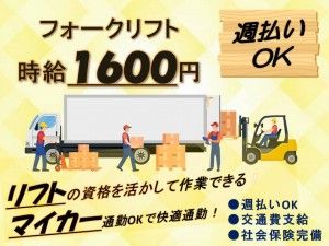 フォークリフトのスタッフ大募集!時給は1600円(*^^*)夜勤もあるから稼げる!土日は休みでプライベート充実♪