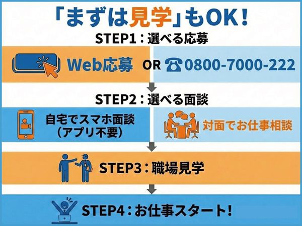 選考フロー 【選考プロセス】 応募 → 面談 → 選考 → 職場見学 → お仕事開始 【応募方法】 Web:「応募する」ボタンより。追って担当者から連絡します。 電話: 0800-7000-222(平日 8:30~17:00) ✅Point: 職場を見学してから働くか決められるので安心です! 【面談について】 Web面談: アプリ・ログイン不要。スマホで自宅から手軽に実施可能です。 対面・出張: 福岡営業所(久留米)などでのお仕事相談会も実施中。 日程や場所はお気軽にお問い合わせください(要予約)。