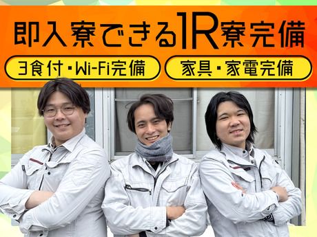【保険制度】 雇用保険、労災保険、健康保険、厚生年金 待遇・福利厚生 【福利厚生】 ・入社祝い金3万円支給(規定あり) ・社会保険完備(法令に則り適用) ・日払い・週払い可(規定有) ・制服貸与 ・医療費負担制度有 ・資格取得支援 ・残業・他各種手当有 ・個室寮完備(即入居OK/食事3食付/TV・冷蔵庫・冷暖房・お風呂・食事3食付・食堂・Wi-Fi完備)