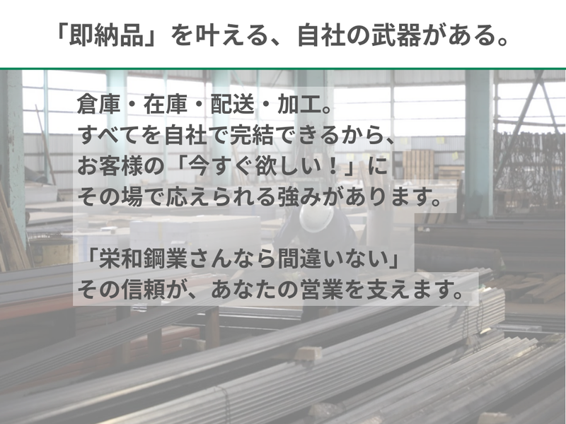 仕事内容 ⭐ノルマなし! 既存のお客様との関係性を大切にする営業 ⭐基本土日祝休み で私生活も充実 ⭐月給24万円〜+充実の手当で安定収入! ⭐残業少なめ! 効率よく働いて早めに帰る社風 ⭐将来的にCAD(設計)スキルも身につく! ⭐北海道の冬も安心「冬季燃料手当」あり♪ *‥‥*‥‥*‥‥*‥‥*‥‥*‥‥* 「今のままでいいのかな…」 と将来が漠然と不安。 「自分にしかできない スキルを身につけたい」 「でも、いきなり 営業ノルマに追われるのは怖い」 そんな想いを抱えているあなたへ。 創業69年の安定企業、 栄和鋼業で新しい キャリアをスタートしませんか? まずは「鋼材の名前」を覚えるところから。 ゆくゆくは図面も書ける “市場価値の高い営業”へと、 私たちが責任を持って育て上げます!✨ *‥‥*‥‥*‥‥*‥‥*‥‥*‥‥* ■「ここなら安心」と若手が実感する、 栄和鋼業の魅力 ┈┈┈┈┈┈┈┈┈┈┈┈┈┈┈┈•• ✅【焦らなくていい】最長半年の研修期間 「いきなり売ってこい!」 なんてことは絶対にありません。 まずは倉庫で商品の名前を覚えたり、 事務所で起票の仕方を学んだり。 基礎をしっかり固めてから 営業デビューできるので、 自信を持ってお客様の前に 立てるようになります! ✅【武器が増える】営業+CAD(設計)スキル 当社の営業は、 ただ鋼材を売るだけに留まりません。 ゆくゆくはCADというソフトを使って、 図面作成もできるようになっていただきます。 ✅【社長がいつも見てくれる】頑張りを見逃さない距離感 社長の宮澤は、 毎日どこかの拠点に顔を出します。 「最近どう?」 「困ってることない?」 そんな風に気さくに声をかけてくれるので、 悩みもすぐに相談できる 風通しの良さが自慢です! ■実際のお仕事内容 ┈┈┈┈┈┈┈┈┈┈┈┈┈┈┈┈•• 鉄工所や建設会社などのお客様先へ、 鉄鋼製品やガスなどの 依頼品を販売・提供するお仕事です! 先々の大量納品だけではなく、 現場での「今日、欲しい!」を 解決できるスピーディーな 納品が強みになります! 【1日の流れ(例)】 08:00|業務スタート。 メールやFAXを一気に確認。 09:00|倉庫・配送と打合せ。 電話等で現場状況を共有し、 スムーズな納品を支えます。 10:00|お客さんと打合せ。 電話で見積の相談に乗ったり、 訪問にて 図面制作の打合せをします。 14:00|製作元へ資料作成。 加工を依頼する先に向けて、 注文書や図面の指示出し。 16:00|夕方の連絡チェックなど… 納期を目安に優先順位を考えて、 テキパキと進めていくことが重要になります! ■教育体制 ┈┈┈┈┈┈┈┈┈┈┈┈┈┈┈┈•• 【入社後〜3ヶ月】 まずは倉庫での実務から。 出荷作業(荷出し)を通じて、 鋼材の種類や名前を じっくり覚えていきます! 【4ヶ月目〜半年】 事務所へ移り、 電話対応や伝票作成を担当。 会社のシステムや 仕事の流れに慣れていきます。 【半年以降】 先輩と一緒に お客様先への訪問を開始。 丁寧な引き継ぎを受けながら、 独り立ちを目指しましょう! ■当社について ┈┈┈┈┈┈┈┈┈┈┈┈┈┈┈┈•• 栄和鋼業株式会社は 一般鋼材や各種高圧ガスを 専門に扱う商社として、 地域のモノづくりを支えています。 最大の強みは、 「自社ですべて完結できる」 という圧倒的な対応力です。 自社倉庫に豊富な在庫を持ち、 加工センターも完備。 さらに、自社配送チームによる スピーディーな納品体制を 整えています。 「困った時は栄和鋼業さん」 そう頼っていただける 確かな信頼関係こそが、 私たちの誇りです。