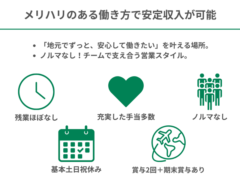 求めている人材 \未経験者歓迎!ルート営業スタッフ募集/ 《必須条件》 ・普通自動車免許をお持ちの方 意欲や人柄、協調性を重視して採用します。 《歓迎条件・経験》 ・周囲と助け合う協調性がある方 ・自ら学ぶ姿勢のある方 ・新しいことに挑戦したい方 ・仲間と協力して働きたい方 ✨ 「登別市・室蘭市・伊達市・白老町などからの通勤者も多数!」 ✨ 「車通勤OK!通勤30〜40分圏内のエリアから多く活躍中」 \\\ ✨スタッフの声✨ /// ■Aさん/20代男性  ̄ ̄ ̄ ̄ ̄ ̄ ̄ ̄ ̄ ̄ ̄ ̄ ̄ ̄ ̄ ̄ ̄ 前職はサービス業で、 将来に漠然とした不安がありました。 でもここに入ってからは、 研修制度を利用し、一からスキルを 身に着けることができました。 基本土日祝が休みなので、 友人と予定を合わせやすく、 プライベートも充実しています。 ■Bさん/30代男性  ̄ ̄ ̄ ̄ ̄ ̄ ̄ ̄ ̄ ̄ ̄ ̄ ̄ ̄ ̄ ̄ ̄ 「営業はノルマが厳しそう」 というイメージでしたが、 ここは既存のお客様がメイン。 信頼関係を築くことが仕事なので、 誠実にスピーディーに向き合えば しっかり評価してもらえます。 住宅手当や燃料手当など、 生活を支える手当が厚いのも 長く続けられる理由です。 ⏩活躍中の先輩の前職をご紹介!⏩ 飲食業、小売業、自衛隊、 工場勤務、倉庫作業、 現場作業、設計業など。 異業種・異職種からの 転職者が多数活躍しています! ⭐ここがポイント!⭐ ┈┈┈┈┈┈┈┈┈┈┈┈┈┈┈┈•• ✅ノルマなし! 既存顧客との関係を大切にする営業 ✅手厚い教育体制で、 未経験から「技術のわかる営業」へ ✅基本土日祝休み&残業少なめで、 自分の時間もしっかり確保 ✅冬季燃料手当など、 北海道の生活を支える福利厚生
