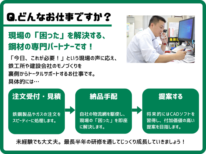 仕事内容 ✨栄和鋼業の魅力ポイント✨ ✅未経験から 月給25万円以上+充実手当 ✅最長半年の手厚い研修 ✅残業少なめ! 定時帰りを推奨する社風 ✅ノルマなし! 既存のお客様を大切にする営業 ✅一生モノのCAD(設計)スキルが身につく ✅北海道の冬も安心☃️ 冬季燃料手当あり ✅有給が取りやすく、風通しの良い環境 *‥‥*‥‥*‥‥*‥‥*‥‥*‥‥* 「今のままでいいのかな…」 と将来が漠然と不安。 「自分にしかできない スキルを身につけたい」 「でも、いきなり 営業ノルマに追われるのは怖い」 そんな想いを抱えているあなたへ。 創業69年の安定企業、 栄和鋼業で新しい キャリアをスタートしませんか? まずは「鋼材の名前」を覚えるところから。 ゆくゆくは CADというソフトを使って、 図面も書ける “市場価値の高い営業”へと、 私たちが責任を持って育て上げます!✨ *‥‥*‥‥*‥‥*‥‥*‥‥*‥‥* ■お仕事内容 ┈┈┈┈┈┈┈┈┈┈┈┈┈┈┈┈•• 一言でいうと、 ”鉄工所や建設会社などの モノづくりの現場を トータルサポートするお仕事”です。 先々の大量納品だけではなく、 現場での「今日、欲しい!」を 解決できるスピーディーな 納品が強みになります! 【具体的には…】 ■お客様からの注文受付・見積作成 (製品:鉄鋼製品やガスなど) ■現場への納品手配 (スピーディーさが自慢!) ■将来的にはCADを使った図面作成 など… 【1日の流れ(例)】 08:00|業務スタート。 メールやFAXを一気に確認。 09:00|倉庫・配送と打合せ。 電話等で現場状況を共有し、 スムーズな納品を支えます。 10:00|お客さんと打合せ。 電話で見積の相談に乗ったり、 訪問にて 図面制作の打合せをします。 14:00|製作元へ資料作成。 加工を依頼する先に向けて、 注文書や図面の指示出し。 16:00|夕方の連絡チェックなど… ■育成ステップについて🌱 ┈┈┈┈┈┈┈┈┈┈┈┈┈┈┈┈•• 📍STEP1|入社〜3ヶ月 【現場を知る】 まずは倉庫での 出荷作業(荷出し)からスタート。 「この重いのがH鋼か!」 「これがガスボンベか!」と、 実際に商品に触れながら、 名前と形を一致させていきます。 📍STEP2|4ヶ月〜半年 【流れを知る】 事務所に移り、 電話対応や伝票作成を学びます。 「お客様からどんな注文が来るのか」 「社内のシステムはどう動くのか」 事務作業を通じて、仕事の全体像を掴みます。 📍STEP3|半年以降 【顔を覚える】 いよいよ先輩に同行して、お客様先へ。 「新人の〇〇君です!」と紹介されながら、 丁寧な引き継ぎを受けて 独り立ちを目指します。 📍STEP4|その先は… 【武器を増やす】 営業に慣れてきたら、 CAD(設計ソフト)にも挑戦! 図面が書ける営業は、 業界でも重宝される存在です。 あなたの市場価値は、 ここでグンと上がります✨ ■ 気になるQ&Aにお答えします! ┈┈┈┈┈┈┈┈┈┈┈┈┈┈┈┈•• 福利厚生や働きやすさを重視するあなたへ よく聞かれる質問に ズバリ、お答えします!✨ Q. 本当に未経験でもやっていけますか? A. 大丈夫です。 「いきなり売ってこい!」 なんてことは絶対にありません。 最長半年の研修を通して 基礎をしっかり固めてから 営業デビューできるので、 自信を持ってお客様の前に 立てるようになります! ┈┈┈┈┈┈┈┈┈┈┈┈┈┈┈┈┈┈ Q. お休みについて詳しく知りたいです! A. 基本は土日祝休みです。 3週間に1回、 土曜の午前出勤がありますが、 電話も少なく落ち着いているので、 週明けの準備をする 「自分を整える時間」として 活用する人が多いです。 残業も少なめで、有給も遠慮なく取れる 雰囲気なので、 リフレッシュもバッチリです! ┈┈┈┈┈┈┈┈┈┈┈┈┈┈┈┈┈┈ Q. 本当にノルマはないんですか? A. はい、 個人に課される厳しいノルマはありません。 もちろん事業所としての目標はありますが、 個人を厳しく追い込むような空気はありません。 社長自ら「うちは優しい人が多いよね」 と話すほど、おだやかな雰囲気。 「前の職場では毎日胃が痛かった…」という方も、 ここでは肩の力を抜いて、 のびのびと個性を発揮しています。 ■当社について ┈┈┈┈┈┈┈┈┈┈┈┈┈┈┈┈•• 栄和鋼業株式会社は 一般鋼材や各種高圧ガスを 専門に扱う商社として、 地域のモノづくりを支えています。 「困った時は栄和鋼業さん」 そう頼っていただける 確かな信頼関係こそが、 私たちの誇りです。