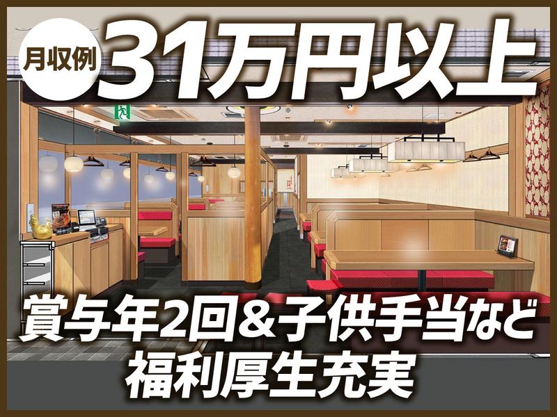 【保険制度】 雇用保険、労災保険、健康保険、厚生年金 待遇・福利厚生 【福利厚生】 ◇バイク・自転車通勤OK ◇店長特製!絶品まかない付 ◇制服貸与(無料) ◇頑張りは評価!随時昇給有(昨年度実績/月3万円※業績による) ◇社員旅行有 ◇賞与年2回(※業績による) ◇子供手当1人5000円 ◇休日出勤手当あり ◇髪色・髪型・ピアス自由(要清潔感)