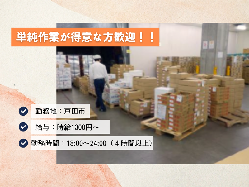 仕事内容 戸田市内の大型倉庫が勤務地! ピッキングスタッフ積極採用中です♪ ★経験不問! ★未経験者大歓迎! 【具体的な仕事内容】 青果センター内での 野菜のピッキング作業をお任せします。 スーパーに並ぶ野菜を、 伝票を見ながら仕分けするお仕事です。 仕分けるのは「みかん箱くらい」の 段ボールやカゴに入った青果物。 箱ごと移動するため、 ある程度の体力が必要ですが、 女性スタッフも多数活躍しています! 作業内容はシンプルで、 未経験の方でもすぐに慣れていただけます。 仕分けた商品は、同じ敷地内でパレットに乗せて完了です。 ⭐ 週3日~OK!勤務日数の相談も可 残業もほぼなし!!で働きやすい♪  ̄V ̄ ̄ ̄ ̄ ̄ ̄ ̄ ̄ ̄ ̄ ̄ ̄ ̄ ̄ ̄ ̄ ̄ 週3日~勤務OKです! 自分の好きな曜日が選べます! また、残業はほとんどないので プライベートな時間も有効に使えます。 しっかりとオンオフある環境の方が プライベートが充実させることができ、 その分、仕事にもしっかり打ち込めると 考えています。 「休日に楽しみがあるから仕事も頑張れる」 同じ考えの方も多くいらっしゃるのでは ないでしょうか? お休みもしっかり取れるので、 無理なく働けるのも魅力の一つ。 ぜひ、お仕事もプライベートも 充実させてください♪ ★〓★〓★〓★〓★〓★〓★〓★〓★ スタッフ同士助け合いながら 仕事をしているので、 みなさん長く働いてくれています。 特に、倉庫内作業スタッフたちで 大切にしていることは「チームワーク」 1人ではなく、チーム全員で 仕事を進めている職場です♪ 笑いの絶えない職場では、 幅広い年代の方が活躍しています。 分からないことは近くにいる先輩に 聞いてもらえれば対応します! 長く腰を据えて働きたいと 考えている方にはピッタリです✨✨ ★〓★〓★〓★〓★〓★〓★〓★〓★
