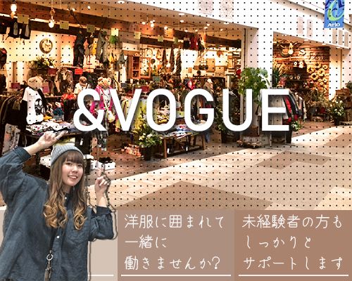 仕事内容 好きなものに囲まれて、 「自分らしさ」を楽しむ仕事をー お気に入りの洋服や、心がときめく雑貨。 誰かの「好き」にそっと寄り添う。 そんなand.vogueのアイテムたちが並ぶ店内で、 あなた自身も“自分らしいスタイル”で働いてみませんか? 【どんなお仕事?】 ・and.vogueのお洋服や雑貨の接客販売 ・商品のレイアウトやディスプレイ ・レジ対応や品出し、ストック整理 など 【はじめから全部できなくていいんです】 and.vogueが大切にしているのは、 “モノ”より“コト”を届けるような接客。 「これ、私も持ってます」「これ人気なんですよ〜」 そんな何気ない会話で、 お客様が思わず笑顔になる瞬間を一緒につくっていきましょう。 まずは、あいさつや笑顔からでOK。 あなたらしいペースで少しずつ慣れていってくださいね。