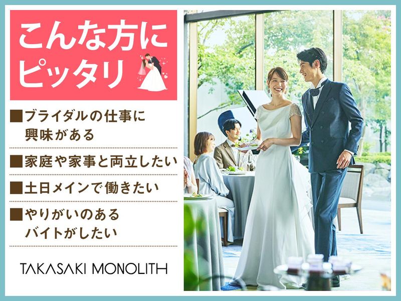 仕事内容 *モダンで美しいチャペルのあるブライダル会場* 感動いっぱいの結婚式を一緒にサポート♪ 週1~の柔軟シフトでWワーク・副業OK! フリーター・主婦パートさんも活躍中♪ 高崎モノリスは 透明感のあるガラス張りのチャペルと 美しい日本庭園がある結婚式場。 ウェディングのお手伝いをするお仕事です◎ ―――――――――――――――― フリーター・社会人さん・主婦さんに オススメのポイントはこちら★★ ―――――――――――――――― ・週1日~1日4時間~OKで融通◎ ・平日・土日どちらも勤務可能、 本業が休みの土日だけ等大歓迎! ・かけもち・副業OK! ・絶品のまかないアリ(^^) まかないは本格料理人たちが 美味しい食材を使って作ってくれます♪♪ 現在は20代・30代・40代の 社員約10名が活躍しています! ―――――――――――――――― 具体的なお仕事内容は…? ―――――――――――――――― 結婚式場のフロントスタッフとして 次のお仕事をお任せ! ■お客様のご案内 ■お荷物の預かり ■結婚式の飾り付け ■チャペルや各部屋の清掃 ■お荷物の梱包 ■ご予約対応 など ※平日は事務作業、 土日はフロント業務or事務作業となります。 プランナーのサポートがメインです◎ 会場の"顔"となり、 お客様を一番にお迎えするお仕事。 爽やかな笑顔で、 素敵な結婚式を一緒に作りましょう!