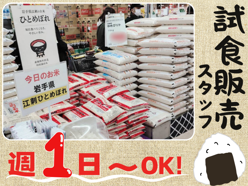 仕事内容 ✨✨スタッフ増員募集✨✨ ⭐月収10万円以上も可能!手当も充実! ⭐週1日~OK!勤務日数調整可能! ⭐家庭と両立するパートさん活躍中 ⭐40~50代の方も活躍中! ‥‥‥‥‥‥ 仕事内容 ‥‥‥‥‥‥ スーパーでブランド米のPR販売を お願いします。 試食をおすすめしたり、 お米の特徴を紹介したりしながら、 お客様にお米の魅力を伝えるお仕事です。 「おいしい!」の笑顔や 「ありがとう」の言葉を 直接もらえるやりがいがあります✨ ‥‥‥‥‥‥‥‥‥‥‥‥ ココがポイント! ‥‥‥‥‥‥‥‥‥‥‥‥ ✅ 未経験歓迎:研修ありで安心スタート ✅ 知識ゼロOK:扱うのは「お米」だけ! 商品数が少ないから覚えやすい◎ ✅ 笑顔がやりがいに:接客が好きな方、 お話し好きの方にぴったり! ✅ 週1日~OK! 家庭やWワークと両立可能◎ ✅ 手当充実・月10万以上も可能✨ ‥‥‥‥‥‥‥‥‥‥‥ やりがいも十分♪ ‥‥‥‥‥‥‥‥‥‥‥ お客様から 「このお米、 迷ってたけど試食できてよかった!」 と声をかけてもらえることも。 季節や産地・銘柄ごとに お米の違いを学べるので、 働きながら「お米博士」にもなれます⭐ ‥‥‥‥‥‥‥‥‥‥‥ スタッフの声 ‥‥‥‥‥‥‥‥‥‥‥ 28歳/女性スタッフ(北海道出身) 私は小さい頃からお米が大好きでした(笑) 「お米の魅力をもっと多くの人に伝えたい」 という想いから、この仕事を始めました! ここではさまざまな産地のお米を知ることができ、特徴や美味しさをお客様にお伝えできるのがとてもやりがいになっています。 自分が紹介したお米を 「美味しかったよ!」と言っていただけた時はとても嬉しいですね。 この仕事やってよかったな、と思います! ‥‥‥‥‥‥‥‥‥‥‥ 長期勤務で安定性抜群! ‥‥‥‥‥‥‥‥‥‥‥ ⏩ 通年でお米の販売を行っているので、 長期的に安心して働けます ⏩ さまざまな勤務地あり! どの範囲であれば通えるかなどは 面接時にご相談ください。 ⏩ 週1日~勤務時間は相談OK! 「家事と両立しながら」 「土日だけ」など 家庭・Wワークと両立しながら働けます◎ ✨日曜・ 土曜(月1・2回ほど)・火曜日 9日、19日、29日にお仕事多数! ※平日のみの勤務はごめんなさい