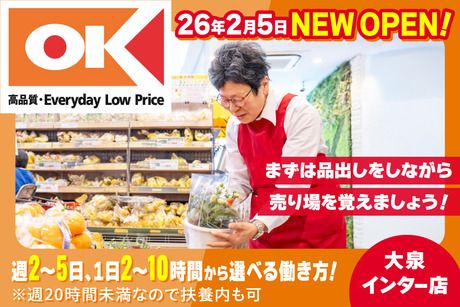 仕事内容 【 お仕事内容 】 ★Wワーク・扶養内OK ★未経験歓迎 【おまかせするお仕事は…?】 ・野菜や果物の袋詰め ・値札シールのペタッと貼り付け ・商品の品出しや、その準備作業 など どれもシンプルで始めやすい作業ばかり◎ 「今日はこんな野菜が入ってる!」 そんな発見も楽しみながら、 季節の旬も自然とわかっちゃう♪ 「最近あんまり外に出てないな…」 そんな方にもおすすめ! 軽く体を動かしながら、気分もリフレッシュできますよ! 【 しっかりした研修あり 】 仕事のやり方やルールなど 基礎から実践までじっくり身につけられます! ・経験豊富な社員がしっかりサポート! ・分からないことも、すぐに聞ける環境◎ ⇒勤務初日から1人にさせない安心の職場です♪ 【 始めやすい環境です 】 \お仕事デビューやブランク明けの方も大歓迎!/ 2026年2月、新規開店したばかり! ■お仕事終わりにそのままお買い物OK♪ 「時間も手間も節約できて助かる!」 そんな嬉しい声がたくさん届いています! 夕方シフトのあとに そのままお買い物できて便利◎ ■短時間勤務OK! 週2~5日の勤務で、 ムリなく続けられる働き方が可能です! ■どんなライフスタイルの方にもフィット! ◎授業やサークルの後に働きたい♪ 「夕方だけ×短時間」のシフトなので 勉強との両立もバッチリ! ◎無理なく健康的に働きたい♪ 短時間なので体への負担も少ない! 日中の用事が終わった夕方に ちょっと体を動かしてリフレッシュ! ◎Wワークをしたい♪ 午前中は他のバイトをして 夕方だけの勤務でもOK! ■ゆとりある人員配置で安心 1店舗あたり社員さんが18~19名いるので わからないこともすぐに相談できて安心♪ 業界的にも社員数が多い職場だから、 とっても心強いですよ! 【 大泉インター店へのアクセス詳細 】 <バスの場合> 国際興業バス「比丘尼橋」下車、徒歩1分 ・地下鉄成増駅から乗車の場合 「成増駅南口」バス停から14分 ※平日は1時間に5本~6本 休日は1時間に4本~5本 ・石神井公園駅から乗車の場合 「石神井公園駅北口」バス停から15分 ※平日は1時間に4本~6本 休日は1時間に3本~5本 <徒歩の場合> 西武池袋線「大泉学園駅」から徒歩25分! 西武池袋線「大泉学園駅」北口を出て グランエミオさん手前のエスカレーターを降ります。 そのまま東急リバブルさん方面へ直進し、 交差点を右に渡ります。 靴流通センターさんを通り過ぎ、1つ目の路地を左折。 すぐに右折し、道なりに進むとT・ジョイさんが見えてきます。 T・ジョイさんを過ぎ直進し 大通りに出ると左手にお店があります。 ※自転車通勤応相談 【 勤務形態について 】 この求人はアシスタントパートナー社員の募集です! アシスタントパートナー社員とは? アルバイト・パートとして、週20時間未満で働く 扶養内勤務可能な勤務形態です!