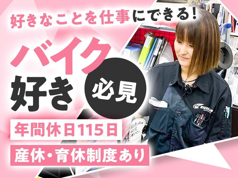 仕事内容 *\“好き”を仕事に!/ 接客やオシャレも楽しめる♪ バイク用品専門店で働こう!* ✦・┈┈┈┈┈┈┈┈ ・✦ バイクにちょっと興味がある… そんな気持ちがあれば大歓迎! 未経験からでも安心して始められる環境で、 趣味や好きを活かしてキャリアアップ♪ ✦・┈┈┈┈┈┈┈┈ ・✦ ◇どんなお仕事?◇ バイク用品やアパレルの販売・接客のお仕事です♪ 流行のアイテムや最新モデルにも触れられて、 毎日楽しく働けます! <具体的には…> ・お客様へのご案内・レジ業務 ・商品のレイアウトやディスプレイづくり ・電話応対やカンタンな受付対応 ・品出し、在庫管理 など ◇未経験でも安心スタート!◇ 「バイクの知識がまったくなかった」という女性スタッフも今は大活躍中! 先輩がしっかりサポート&研修制度もバッチリ◎ わからないことはすぐに聞ける雰囲気です♪ ◇おしゃれも楽しめる!◇ 制服あり&ヘルメットやバイクアパレルにも詳しくなれる! 社割を使って、自分好みのアイテムもお得にGET♡ ◇スキルアップも応援!◇ ・販売スキルが自然と身につく♪ ・資格取得支援制度あり ・商品知識を深める研修も充実! *<働きやすさのPOINT>* ◇年間休日115日/週休2日制! プライベートも大事にしながら働けます◎ ◇残業は月10h前後で少なめ! 毎日ゆっくり自分時間も♪ ◇産休・育休制度あり! ライフステージが変わっても長く活躍できる♪ ◇女性スタッフも多数活躍中! 店舗には20代~30代のスタッフが多く、仲が良いのも魅力! ▽先輩インタビュー(28歳・入社3年目) 「バイクが好き…でも知識ゼロでスタート。 でも先輩がすごく優しくて、少しずつできることが増えていきました♪ 今ではお客様とバイク談義で盛り上がれるのが楽しい! 『ありがとう』って言ってもらえると本当に嬉しいです。」