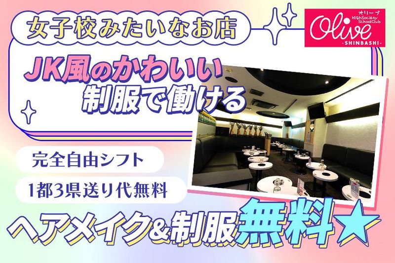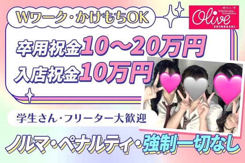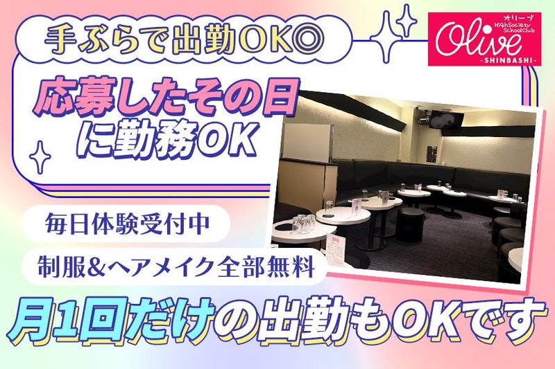 仕事内容 …………………………………… OLIVEで働く特典多数あり✨ …………………………………… ⭐1都3県送り無料♪ ⭐応募したその日に稼げる!即日体入歓迎 ⭐美容手当&医療費負担など待遇充実♪ キャストさんの95%が未経験スタート! ナイトワーク未経験でも、 1日のお給料【日給3万円】は全然現実的!! ✅集客が良い! ✅未経験専門のお店! ✅新橋駅烏森口/西口からスグ! ✅高額バックの種類豊富で待遇も充実✨ ………………………………………… (*‘∀‘){ OLIVEってどんなトコ? ………………………………………… ✅可愛い制服で働ける ✅10代~20代がメインで活躍中 ✅衣装&ヘアメ完全無料! ✅新橋駅から徒歩3分 ✅未経験でも時給3,500円以上 ✅都内で複数店舗展開する大手グループ (*'▽'){ 大手だから待遇もGOOD♪ ✨面接時は『面接交通費支給』 ✨入店祝金『10万円プレゼント』 ✨さらにお友達紹介1人につき『20万円』 ✨ドリンクバック1杯『最大1,000円』 ✨嬉しい『美容手当あり』 ✨医療費は『会社負担』※条件あり ✨広範囲への送りも『無料』 ✨快適な『1Rマンション寮完備』 ………………………………………… ✅特に注目のメリットはコチラ!!! ………………………………………… 特に注目なのが、美容手当✨ 本入店後、継続して働いてくれるだけで 毎月お給料とは別に3万円を支給♪ さらに!!!!! 風邪ひいた…ケガをした…など、 病院にかかる際の医療費の3割負担分を全額 会社が負担してくれて医療費0円!!!! ここまでしてくれるのは、 全国見渡してもプラザグループくらいかも! 至れり尽くせりで働けます✨ ◢◤◢◤◢◤◢◤◢◤◢◤◢◤◢◤◢◤◢◤ ⭐お仕事内容⭐ ◢◤◢◤◢◤◢◤◢◤◢◤◢◤◢◤◢◤◢◤ JK風の制服を着て、 お客様と楽しくお話しするだけ! とってもシンプルなお仕事ですっ✨ 具体的には…  ̄ ̄ ̄ ̄ ̄ ̄ ▼お客様を笑顔でお迎え ▼水割りなどの簡単なお酒作り ▼座って楽しくお話し ▼お客様を笑顔でお見送り …………………… ココがポイント♪ …………………… お話し好きさんにも、 聞き上手さんにもピッタリっ⭐ ドリンクを1杯飲むだけで、 バック=インセンティブとして 最大1000円がお給料に+されます♪ その他、売上げバック20%還元など さまざまな手当で稼げます♪ お酒が飲めない方は、 ソフトドリンクで接客できるので 安心してくださいね✨ ◢◤◢◤◢◤◢◤◢◤◢◤◢◤◢◤◢◤◢◤ ⭐法令遵守の営業を徹底⭐ ◢◤◢◤◢◤◢◤◢◤◢◤◢◤◢◤◢◤◢◤ 運営しているグループは都内で多くの店舗を 手掛ける大手グループ♪ 風営法のルールに則っている優良企業なので 安心して働いていただけます。 ✅ノルマなし ✅罰金・ペナルティなし ✅深夜1時を超える違法営業なし ✅同伴・アフター等の営業も必要なし ✅万全の身バレ対策あり ✅お酒の強要なし ✅連絡先交換なし/任意 ✅女性内勤スタッフ在籍 まずは体験入店で 働きやすさを実感してみてください✨ ━━━━━━━━━━━━━━ ⭐就活・将来にも活かせる⭐ ━━━━━━━━━━━━━━ さまざまな業界・職種のお客様がご来店する ので、お仕事をしながら今まで知らなかった いろんなお話が聞けます♪ お客様のお人柄に合わせた話し方やコミュ力 トークスキルなども身に付いて、近い将来の 就職活動への度胸や自信、人間力も合わせて 身に付けることができますよ◎ ✅対人経験がいかせる!?  ̄ ̄ ̄ ̄ ̄ ̄ ̄ ̄ ̄ ̄ ̄ ̄ 居酒屋さんやカフェなどの飲食店や販売など 接客業の経験などで、対人に抵抗がなければ 今すぐ活躍できますっ♪