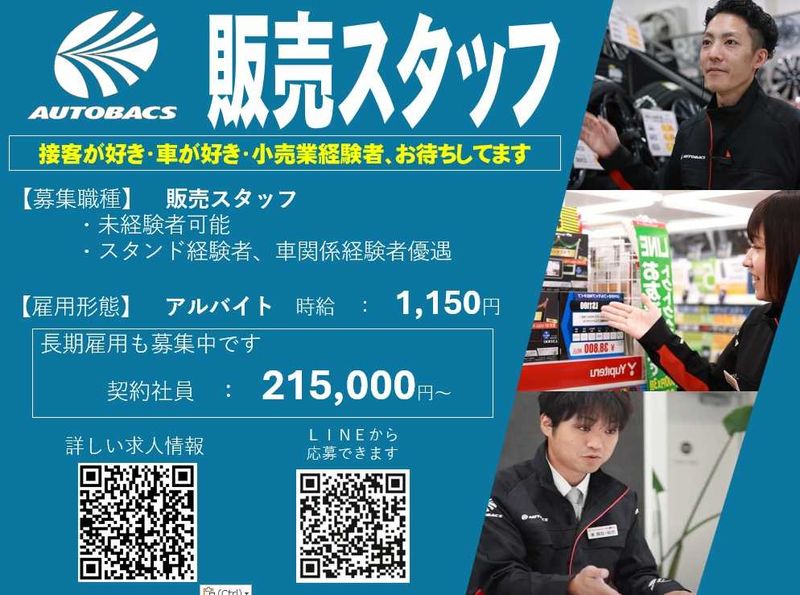 仕事内容 【オートバックス千歳豊里】業務拡大|未経験・ブランクOK|接客・販売スタッフ|アルバイト・パート|高時給|登用あり&実績多数 ●未経験からのお仕事スタートを応援! ●うれしい高時給1150円~ ●フリーターから正社員も目指せます! ●社員割引でカー用品もお得! お客様に商品のご案内や説明など接客業務全般を担当していただきます。 ・商品の仕様や利用方法のご案内 ・お問合せ対応 ・ディスプレイ、売場づくり ・レジ など ●充実フォロー&サポート クルマの知識に不安がある方も大丈夫です! 最初はわからなくて当たり前! 接客や販売、レジ操作も先輩スタッフが全力でサポートするので、未経験からでもスタートしやすい環境です。 お仕事スタートはカンタンな作業からお任せします。 アピールポイント 家事・育児との両立を応援 週4日~・1日6時間~・扶養内と、シフトのご希望はお気軽にご相談下さい。 ご家庭の予定や子育てとバランスを取りながら働きやすいお仕事です。 クルマの知識やお仕事経験が不安… ご安心下さい!知識やお仕事の流れなどは入社後にしっかりレクチャーします! 誰でもみんなはじめての挑戦は不安ですが、スタッフみんなでお仕事スタートをサポートします。 経験やスキルを重ねて昇給も目指せます! アルバイトから約7割が正社員に! フリーターから正社員も目指せます! 契約社員から最短2ヶ月で正社員に登用された実績も! 実力を身につけ、長く安定した将来設計を立てることが可能です。 【1】 アルバイト入社 【2】 契約社員 【3】 正社員登用試験(毎年3月) 【4】 正社員登用 ※ 契約社員・正社員への登用は一定期間の勤務実績と店長推薦が必要 ___________________________________ LINE応募はコチラから! ※ 友達追加で「応募」となります。 ※ トークルームで求人の「店舗・職種・雇用形態」情報の送信をお願いします。 ※ お問合せもLINEからご連絡をお願いします。 採用LINE IDはこちら→ @589hkwr